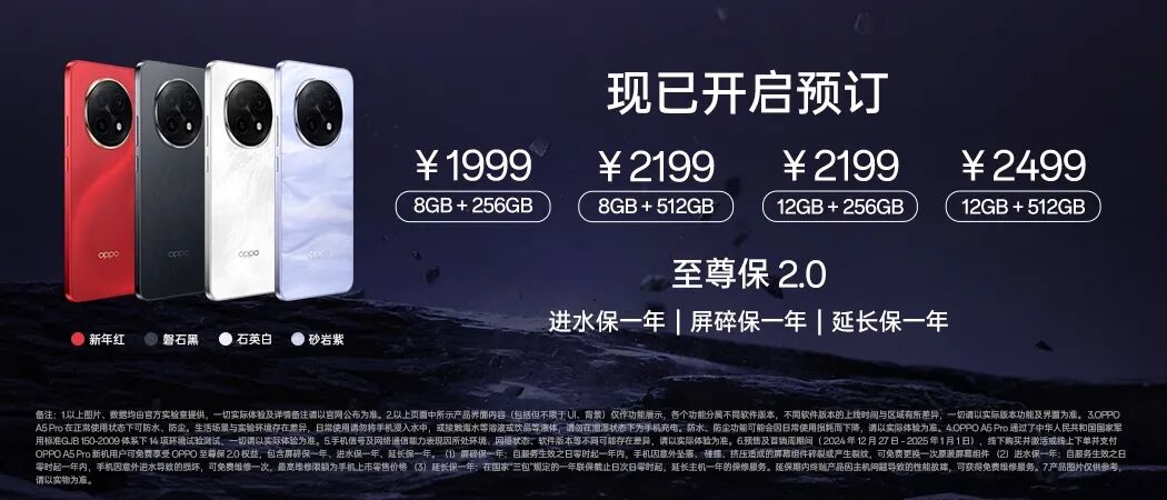 配置上,OPPO A5 Pro采用6.7英寸FHD+ 120Hz居中单挖孔等深四曲屏,短焦光学屏下指纹,塑料中框,康宁Victus2玻璃盖板,金刚石架构,后盖有两种材质,新年红和砂岩紫采用OPPO晶盾玻璃,磐石黑和石英白采用玻纤材质,机身三围161.5*74.85*厚约7.55/7.67mm,重约180g/186g,前置16MP,后置50MP+2MP,天玑7300处理器,6000mAh电池+80W充电。