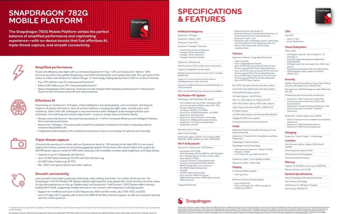 主要规格上,骁龙782G采用台积电6nm工艺,CPU:1*A78大核@ 2.71Ghz➕3*A78中核@ 2.4Ghz➕4*A55小核@ 1.8Ghz,Adreno 642L GPU,集成X53 5G调制解调器,支持LPDDR5 3200MHz、USB 3.1,最高支持FHD+ 144Hz显示屏、200MP单摄等。