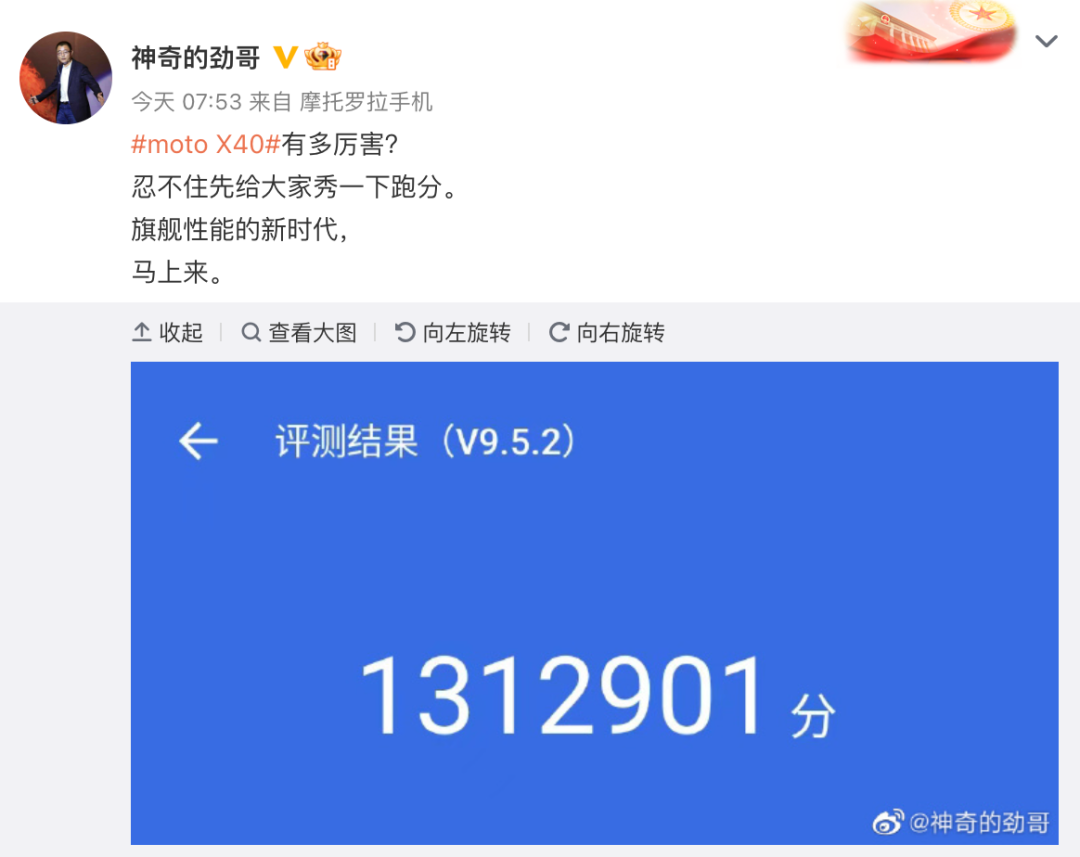 联想中国区手机业务部总经理今天晒出了moto X40的安兔兔跑分,骁龙8 Gen2,安兔兔综合跑分131万分,作为参考:数据库测过的骁龙8+跑分,最高是一加Ace Pro的113.3万分;天玑9000+(iQOO Neo7)是105.27万分,天玑9200工程机是126.17万。(moto没公布下面子项表现和温度等细节,后续需要进一步实测看看表现)