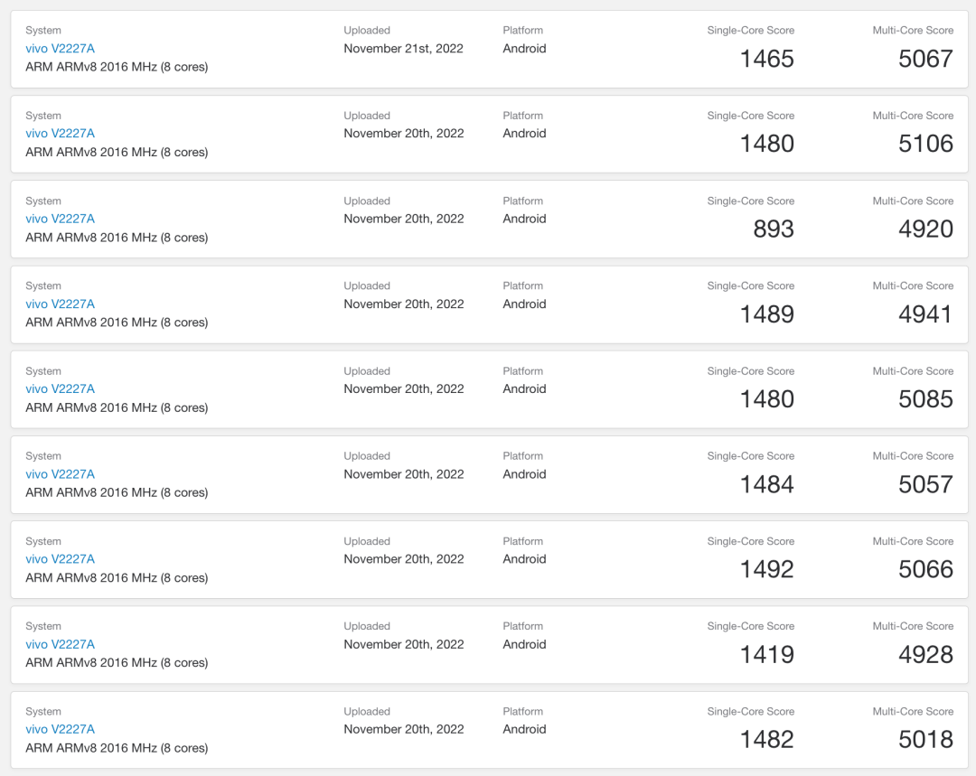 另一边,搭载骁龙8 Gen2、将在11月22日明晚发布的vivo X90 Pro+也有多组Geekbench 5跑分出现,大致稳定在单核1450+/多核5000+左右。