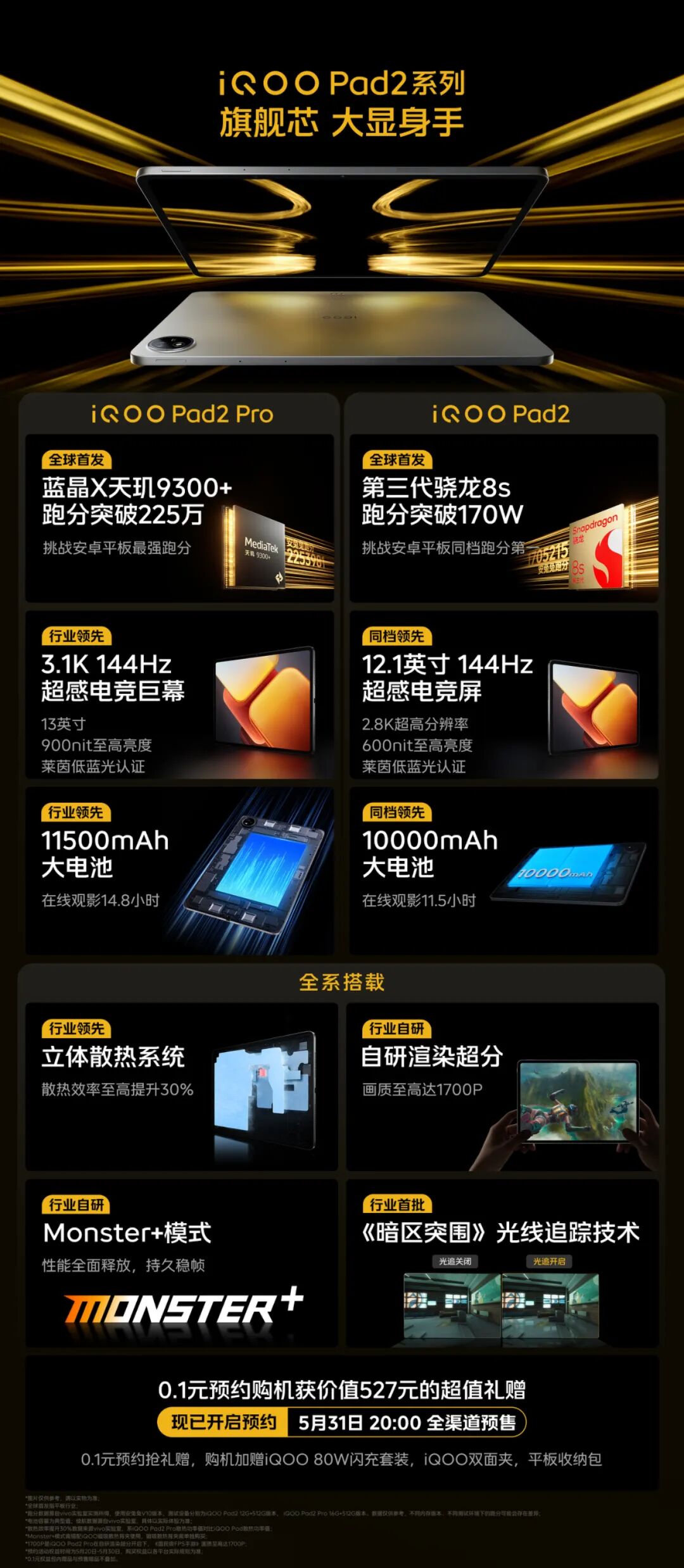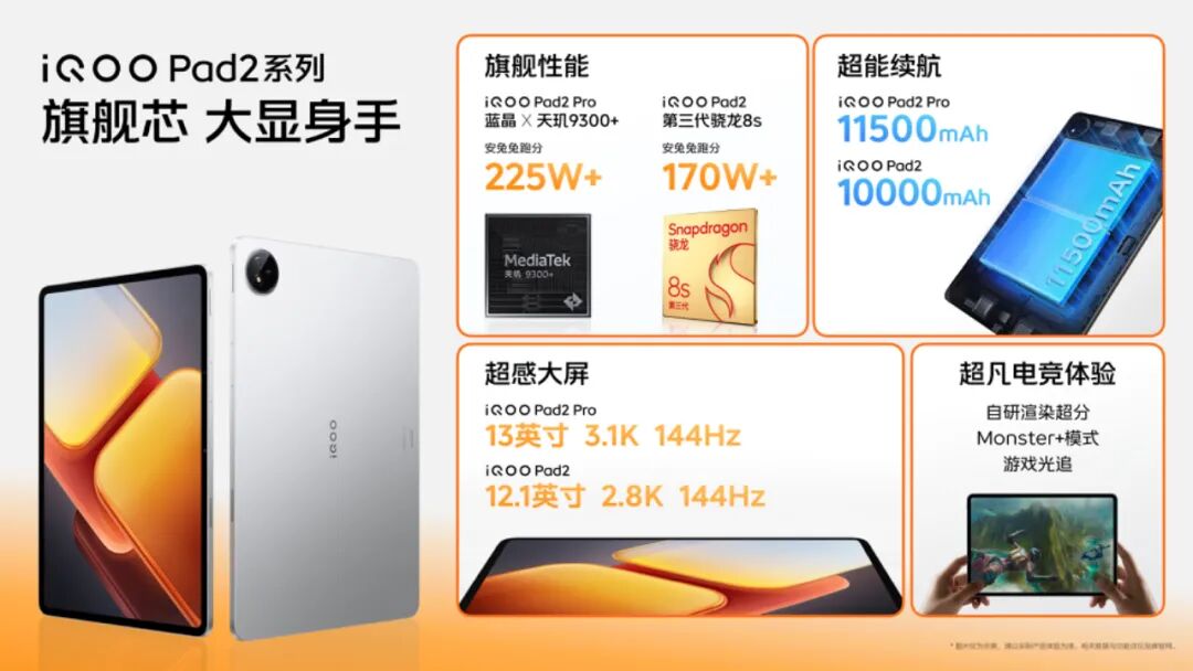 据了解,iQOO Pad 2标准版采用12.1英寸的2.8K 144Hz显示屏,搭载骁龙8s Gen3,配备10000mAh电池;iQOO Pad 2 Pro则采用13英寸的3.1K 144Hz显示屏,搭载天玑9300+,配备11500mAh电池。两款全系支持自研渲染超分、Monster+模式及游戏光追。