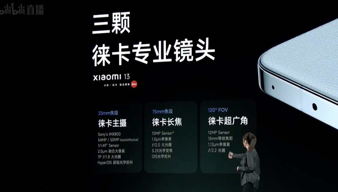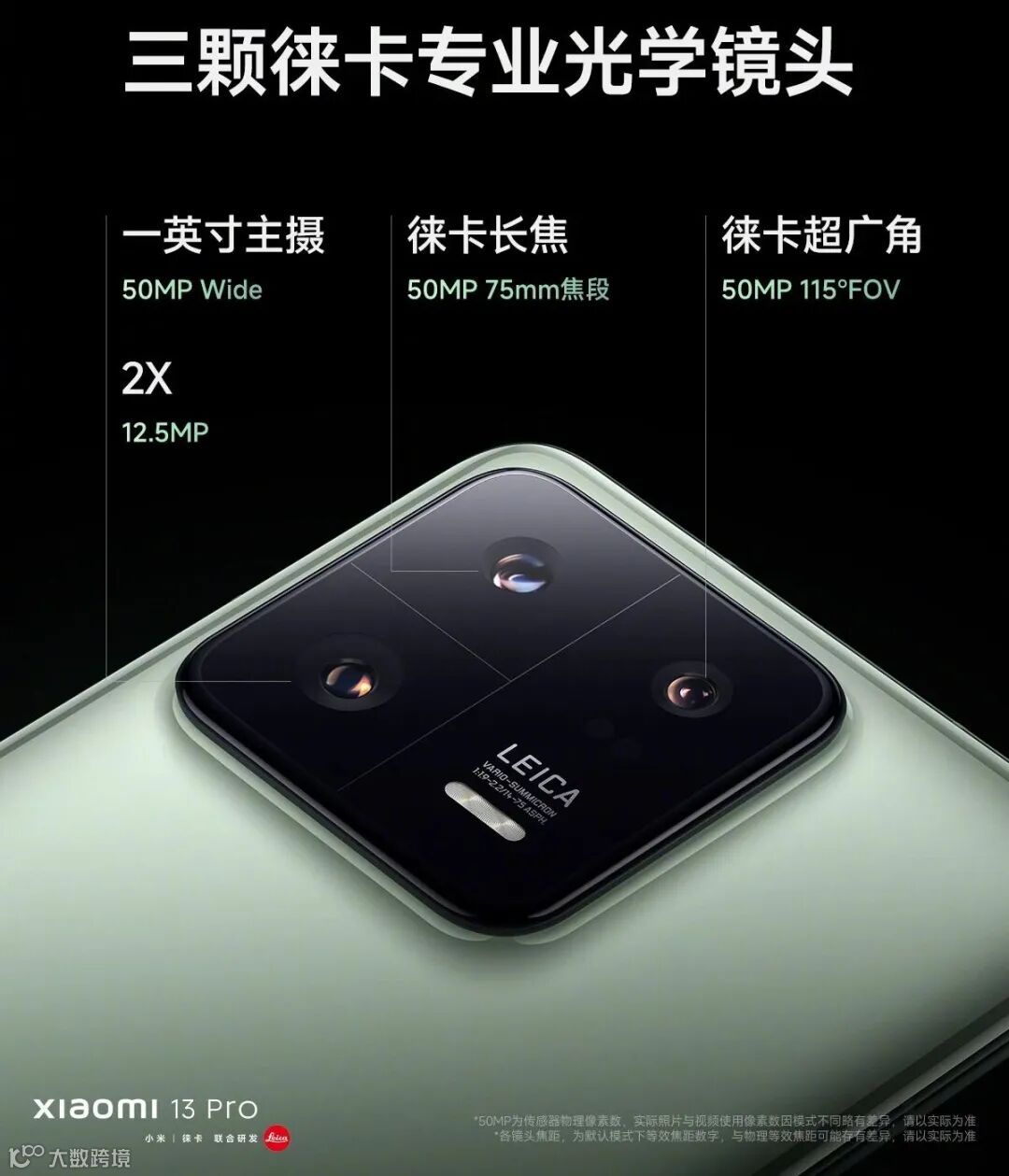 影像部分,小米13 Pro前置32MP,徕卡影像系统,后置三摄①50MP 索尼IMX989一英寸大底主摄(12.5MP 2X)等效23mm,HyperOIS 超级光学防抖②50MP超广角微距 等效14mm ③50MP浮动长焦 有OIS,3.2X光学变焦、70X混合变焦 等效75mm。