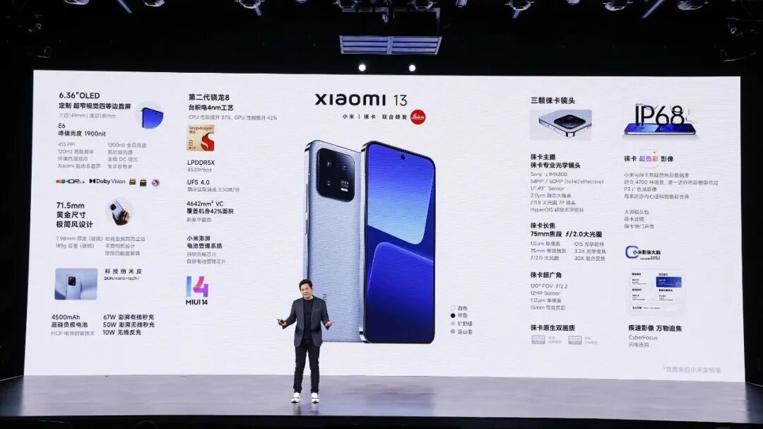 核心配置上,小米13搭载骁龙8 Gen2、LPDDR5X、UFS4.0读取速度最高3.5GB/s(128GB版2.2GB/s),4642mm² VC散热面积,小米澎湃电池管理系统,4500mAh电池、67W有线充电、50W无线充、10W无线反向充电,X轴马达、杜比全景声立体双扬声器、支持IP68防尘防水、红外遥控、 多功能NFC、出厂预装MIUI 14等。