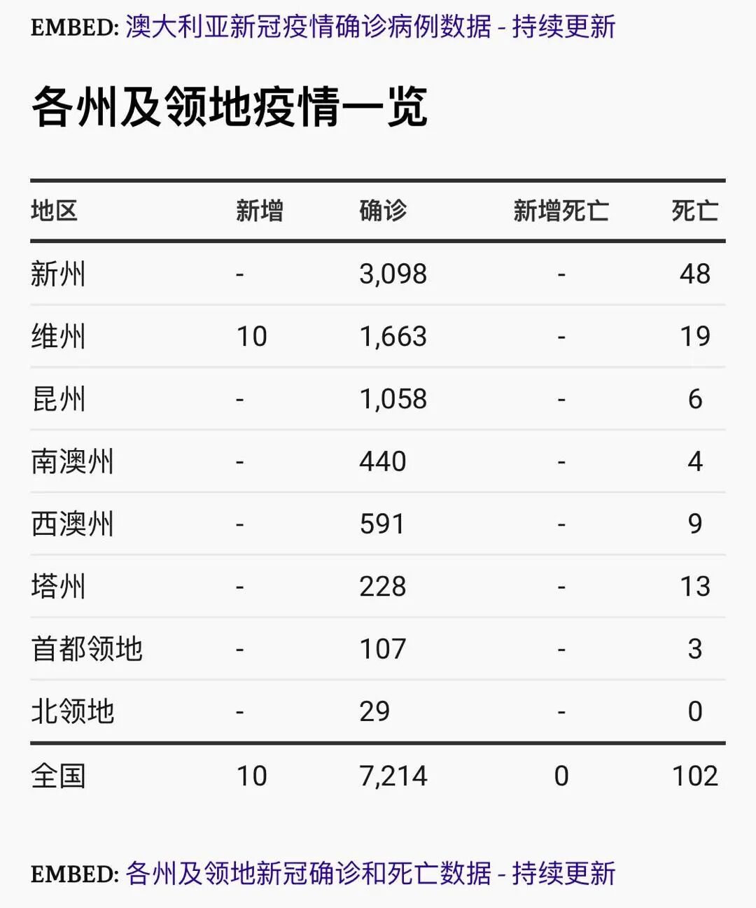 截止发稿前,澳洲累计确诊新冠肺炎患者7214例,死亡102例。其中新州3098例,维州1663例,昆州1058例,西澳591例,南澳440例,塔州228例,北领地29例,首都领地107例。