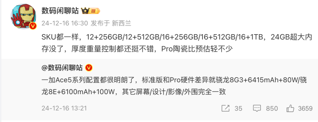 如上图所见,据爆料达人数码闲聊站消息,一加Ace5和Ace5 Pro屏幕、外观设计、影像、外围完全一致,并均将提供12+256GB、12+512GB、16+256GB、16+512GB、16GB+1TB几个SKU,硬件差异主要在于处理器和电池快充方案,Ace5标准版将配备6415mAh+80W充电,而Ace5Pro将配备6100mAh电池+100W有线充。