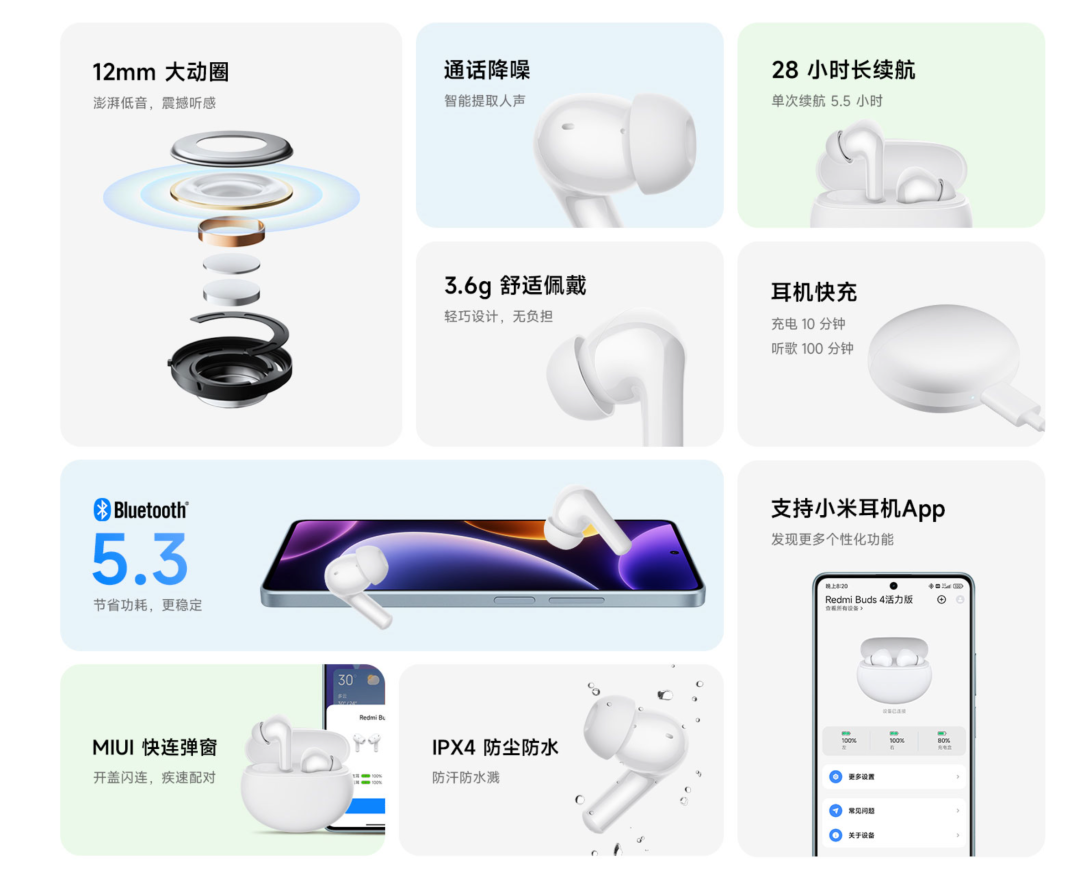 据介绍,Redmi Buds 4活力版采用12mm大动圈,单耳重量约3.6g,单次续航可达5.5小时,充电10分钟听歌100分钟,搭配充电盒最高28小时续航,支持IP54防尘防水,蓝牙5.3,MIUI快连弹窗,支持通话降噪等。
