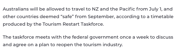 澳大利亚计划在7月1日解除国际旅行的限制。而新西兰和太平洋岛屿国家或将是第一批解封的国家。