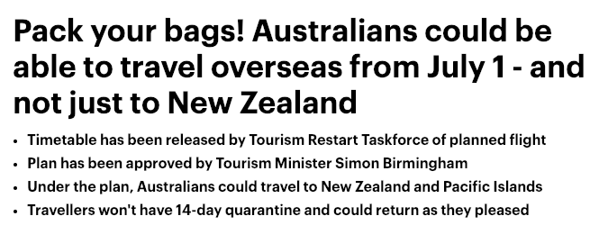如果一切顺利,那么7月1日到9月10日间将为试验期,之后将会考虑纳入其他地区的国际航班。新西兰和太平洋群岛是确定的,但是9月前很可能会增加更多国家,这或许就包括之前政府透露的中国、日本、韩国等亚洲国家。