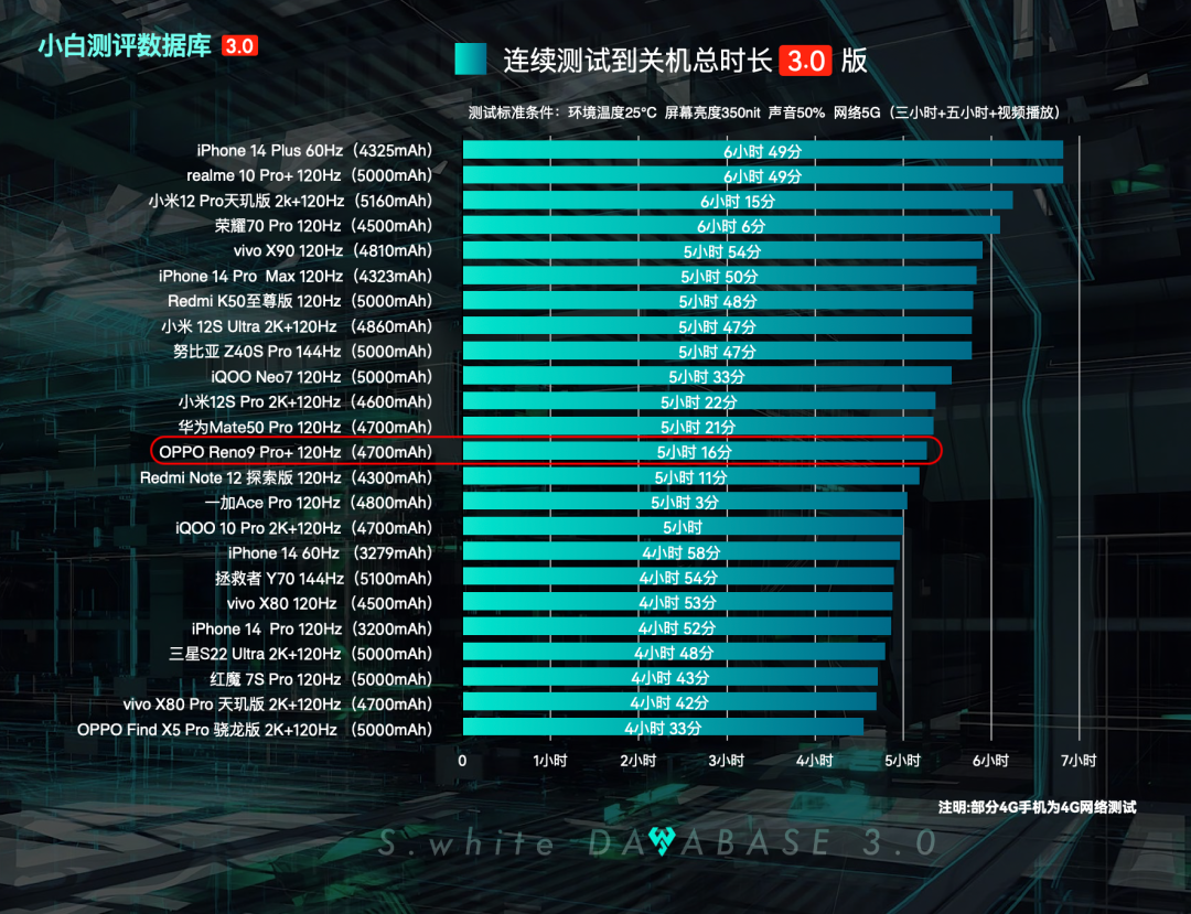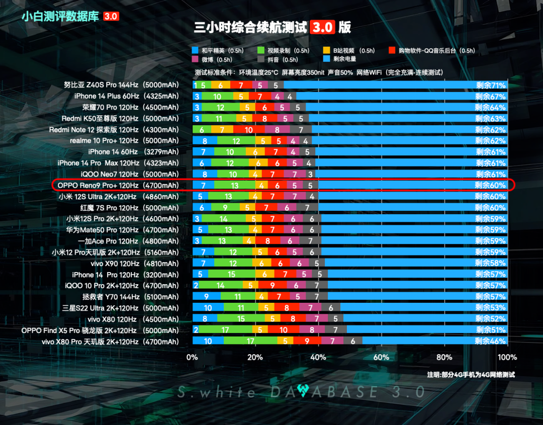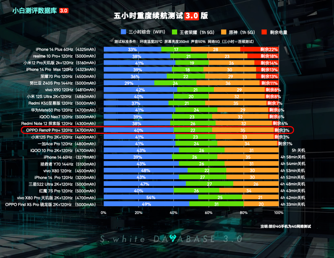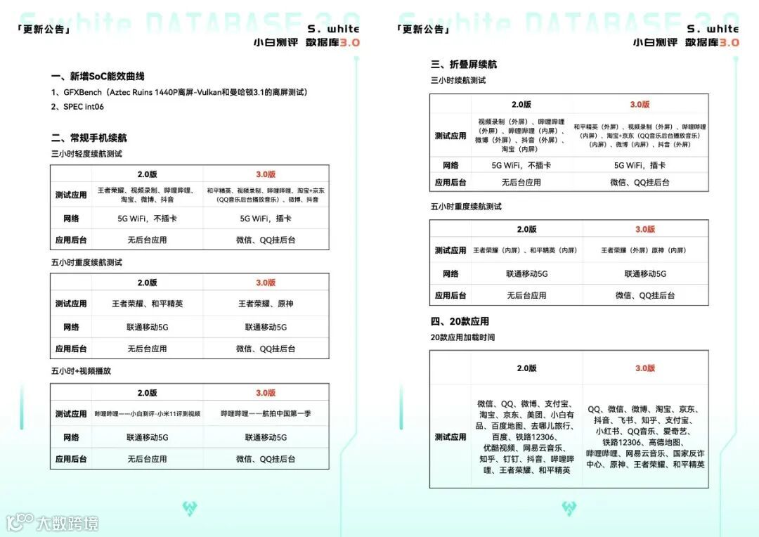 数据库3.0新的续航测试模型相比之前的变化可以看上图,其中「三小时续航」主要新增微信、QQ挂后台(购物软件子项中新增QQ音乐后台),「五小时重度续航」则将《和平精英》换成了功耗更高的《原神》。更多测试模型细节可以在微信公众号后台回复「数据库测试手册」进行查阅。