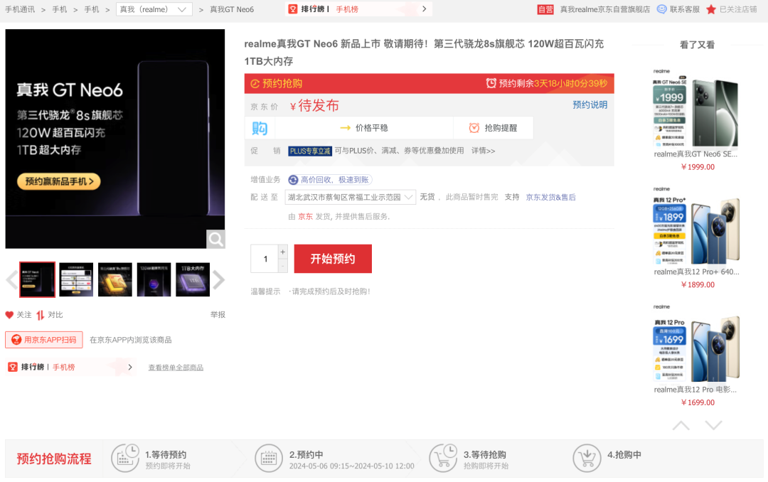 如上图所见,尽管官方尚未预热发布日期,但真我GT Neo6已经率先上架开启盲约,预约界面显示真我GT Neo6将搭载骁龙8s Gen3处理器,配备120W超百瓦闪充,提供最高1TB大存储。细节上,预约界面显示5月10日12点结束预约,但目前仍不知晓具体发布时间。