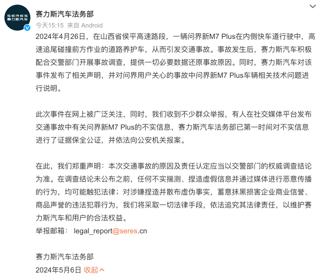 另一边,针对部分网友在社交媒体平台发布交通事故中有关问界新M7 Plus的不实信息,赛力斯汽车法务部表示已第一时间对不实信息进行了证据保全公证,并依法向公安机关报案。