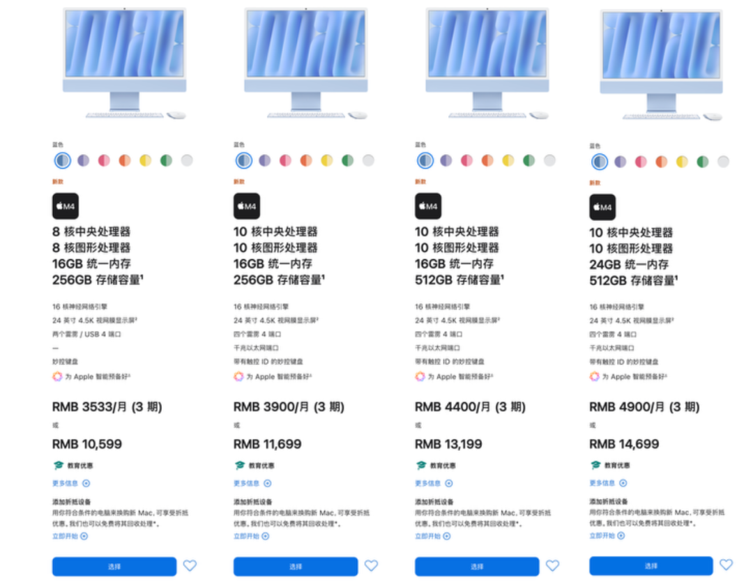 核心配置上,新款iMac搭载M4芯片,全系告别8GB,16GB内存起步,零售价10999元起/教育优惠价10599元起,目前已经开启预购,将于11月8日正式发售。这波有打算入手的吗?