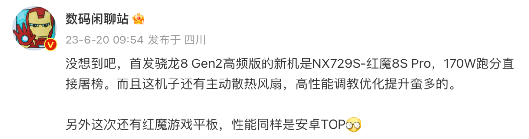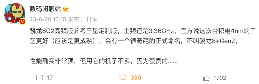 爆料还提到骁龙8 Gen2高频版这次台积电4nm工艺更好,正式命名会很奇葩,不叫骁龙8+ Gen2,用它的机子不多, 成本蛮贵的。(早前爆料一加Ace2 Pro或搭载,但后续消息是考虑到成本最终用了常规版8 Gen2,供大家参考)