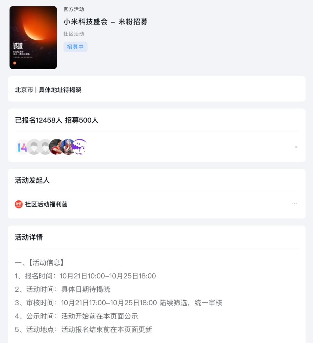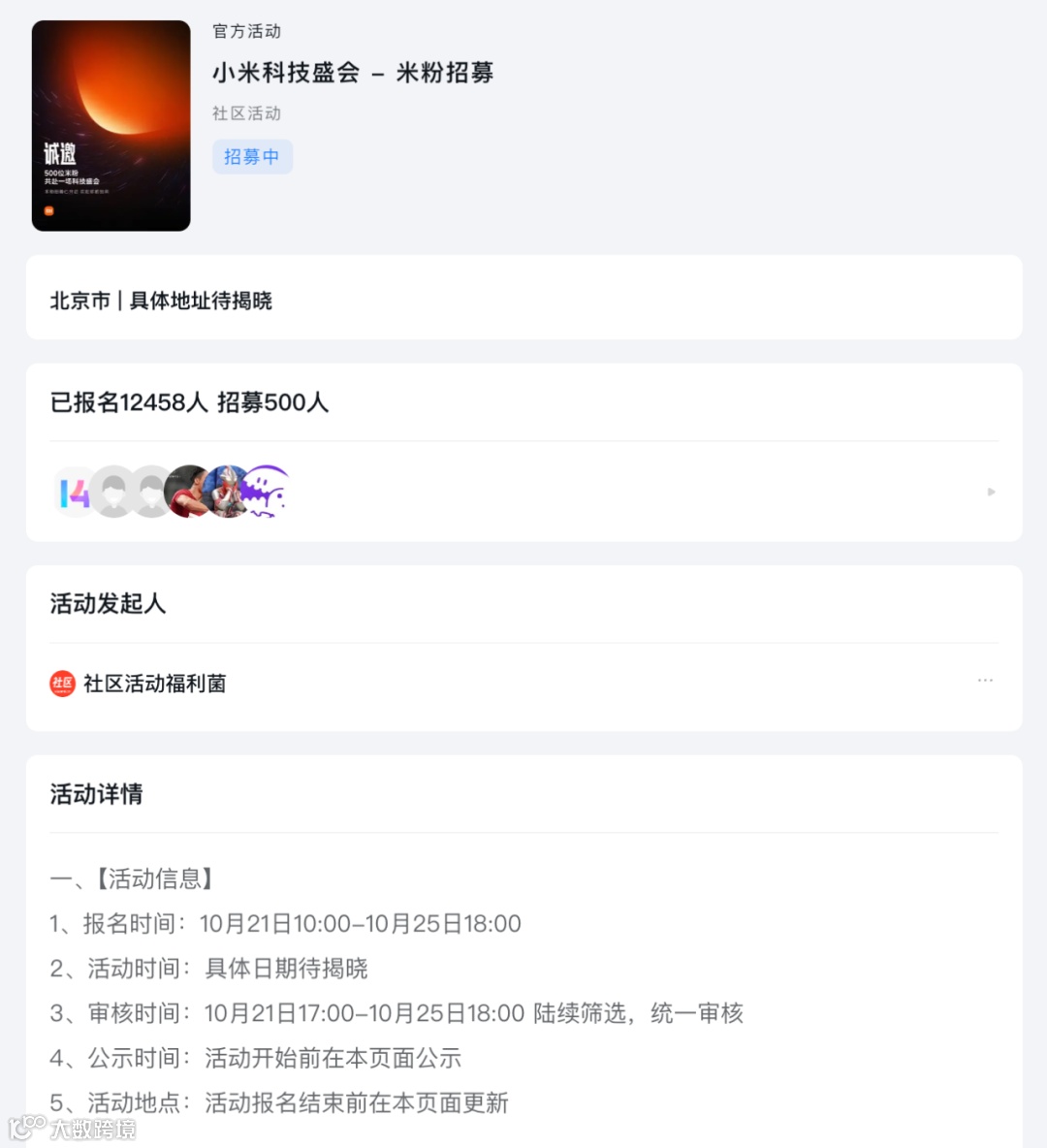 如上图所见,今日小米官方发布了一则招募活动,将邀请500人参加「小米科技盛会」,活动报名截至10月25日18点,中间会陆续筛选,然后公示。虽然具体活动时间和地址暂未公布,但有消息称为10月29日19点-22点。不出意外的话,这应该就是小米15发布会的时间。