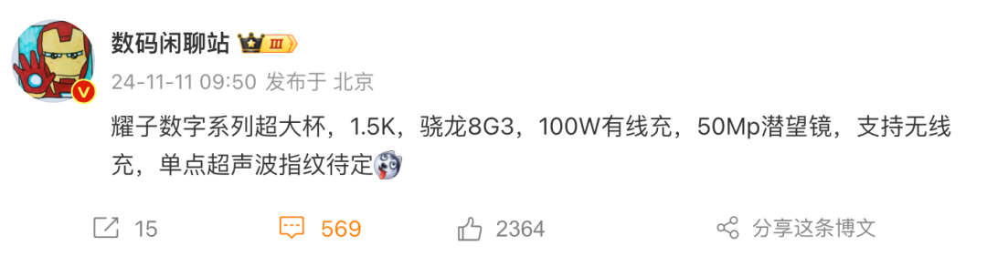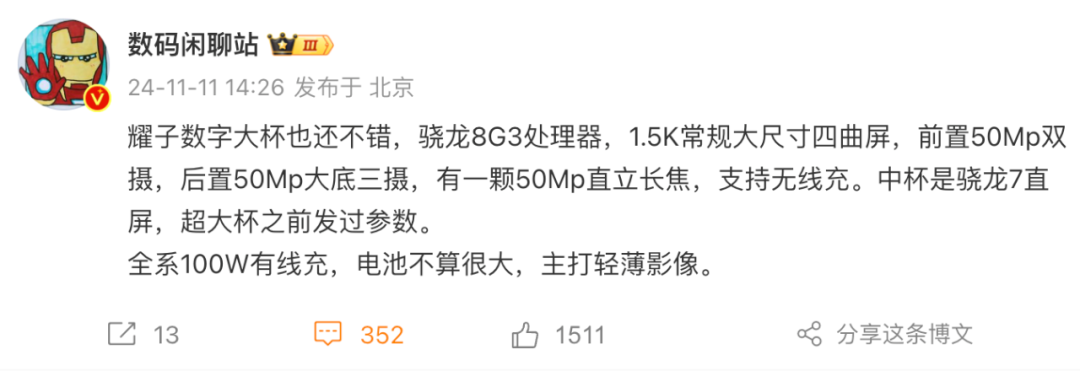 如上图所见,数码闲聊站暗示荣耀300 Pro将搭载骁龙8 Gen3处理器,采用1.5K常规大尺寸四曲屏,前置50MP双摄,后置50MP大底三摄(有一颗50MP直立长焦),支持无线充。荣耀300标准版则预计搭载骁龙7系列SoC,采用直屏。全系100W有线充,电池不算很大,主打轻薄影像。