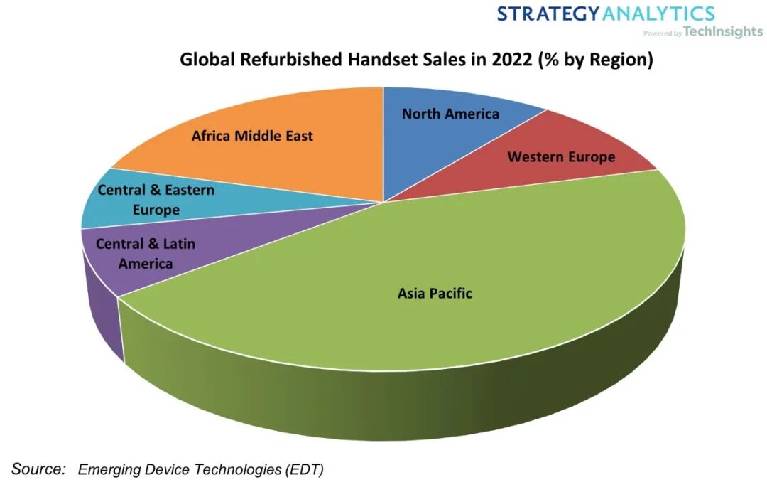 该机构还表示消费者购买的翻新手机数量正在稳步增长,其还分享了一张2022年全球智能手机市场的翻新机销量占比图,显示亚太地区销量最大,大概3/7的占比,随后是非洲中东地区,再然后是北美洲、西欧等市场。