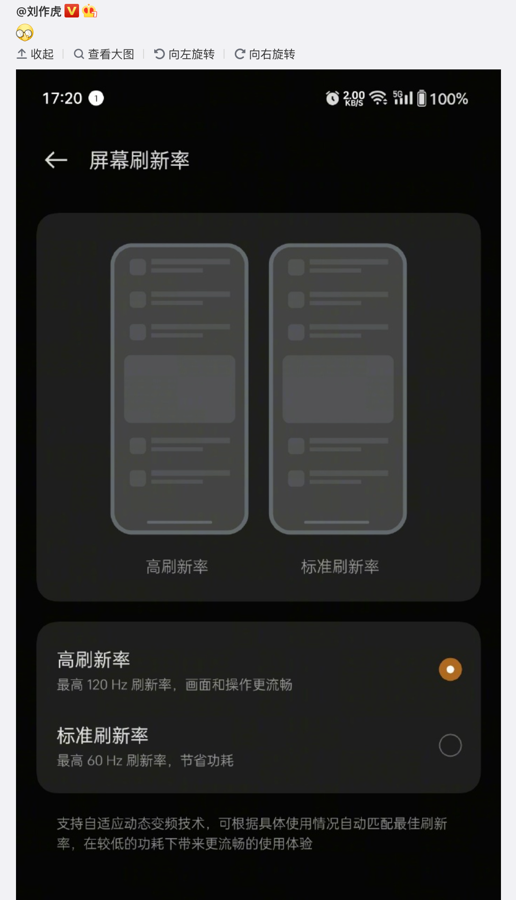 相比初代Find N来说,这次Find N2内外屏都是120Hz,算是补足遗憾了。今天傍晚刘作虎也晒出了一张截图,算是佐证外屏也上了高刷。