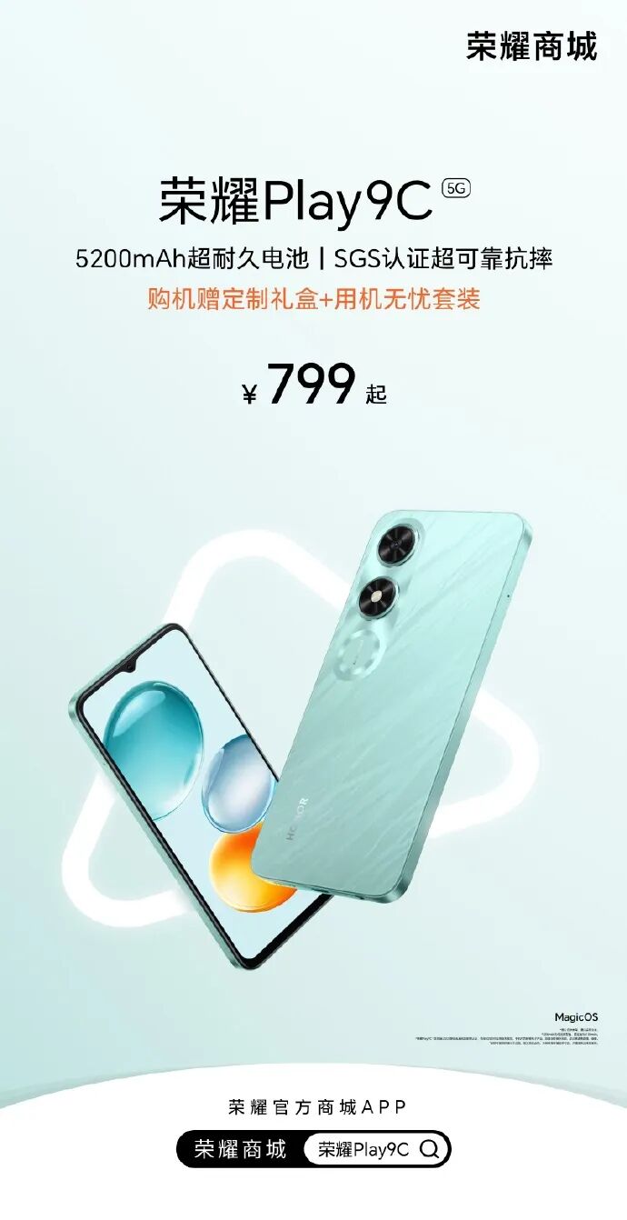 据了解,荣耀Play 9C主要配置有:6.56英寸1612*720分辨率的LCD水滴屏,90Hz刷新率,提供碧空蓝、幻夜黑2个配色,机身三围163.59*75.33*8.39mm,重约190g ,获瑞士SGS整机五星抗跌耐摔认证,前置5MP,后置13MP,搭载联发科天玑6100+处理器(CPU为2*A76 2.2GHz➕6*A55 2.0GHz),内置5200mAh电池,标配5V2A充电器。