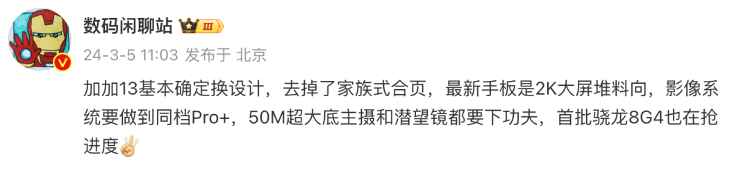 作为补充,早前消息称高通将在3月份更新骁龙7系和骁龙8系SoC,代号分别为SM7675和SM8635,暂命名分别为骁龙7+ Gen3和骁龙8s Gen3,两颗处理器CPU都采用了骁龙8 Gen3同款核心架构,但大核和小核的数量分配和频率有些许不同,GPU也不同,“骁龙8s Gen3”预计是8 Gen3的青春版,现在就等高通发布了,然后各家新机也会陆续登场,到时候又是一场混战~