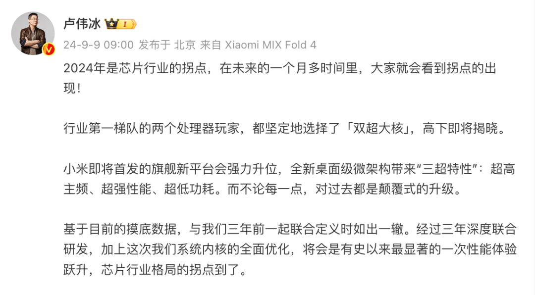 而小米集团合伙人/总裁、国际部总裁、小米品牌总经理卢伟冰还发长文预热:“小米即将首发的旗舰新平台会强力升位,全新桌面级微架构带来“三超特性”:超高主频、超强性能、超低功耗。不论每一点,对过去都是颠覆式的升级。基于目前的摸底数据,与我们三年前一起联合定义时如出一辙。经过三年深度联合研发,加上这次我们系统内核的全面优化,将会是有史以来最显著的一次性能体验跃升,芯片行业格局的拐点到了。” 这里暗示的“小米即将首发的旗舰新平台”显然就是指小米15首发骁龙8 Gen4了~