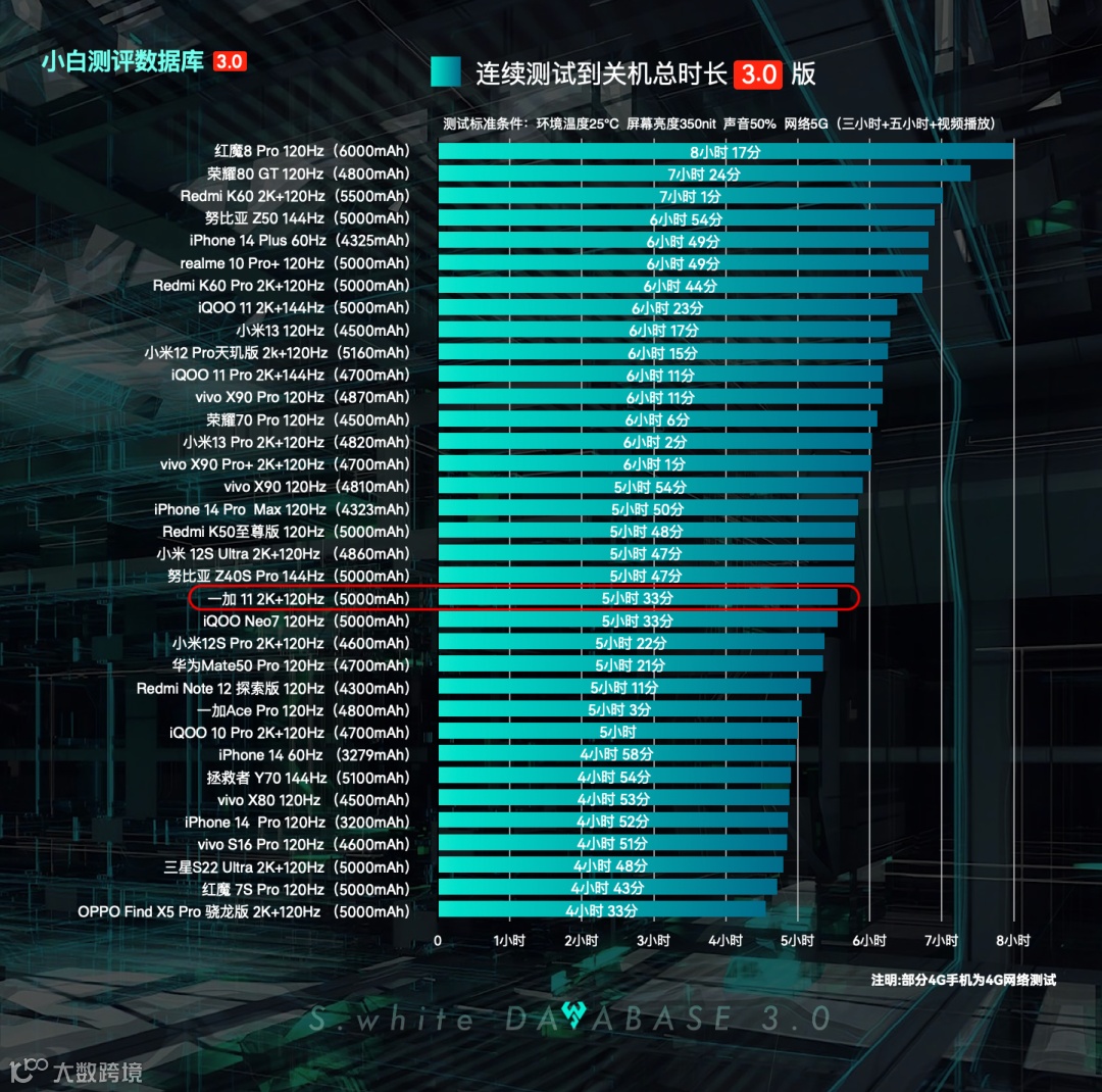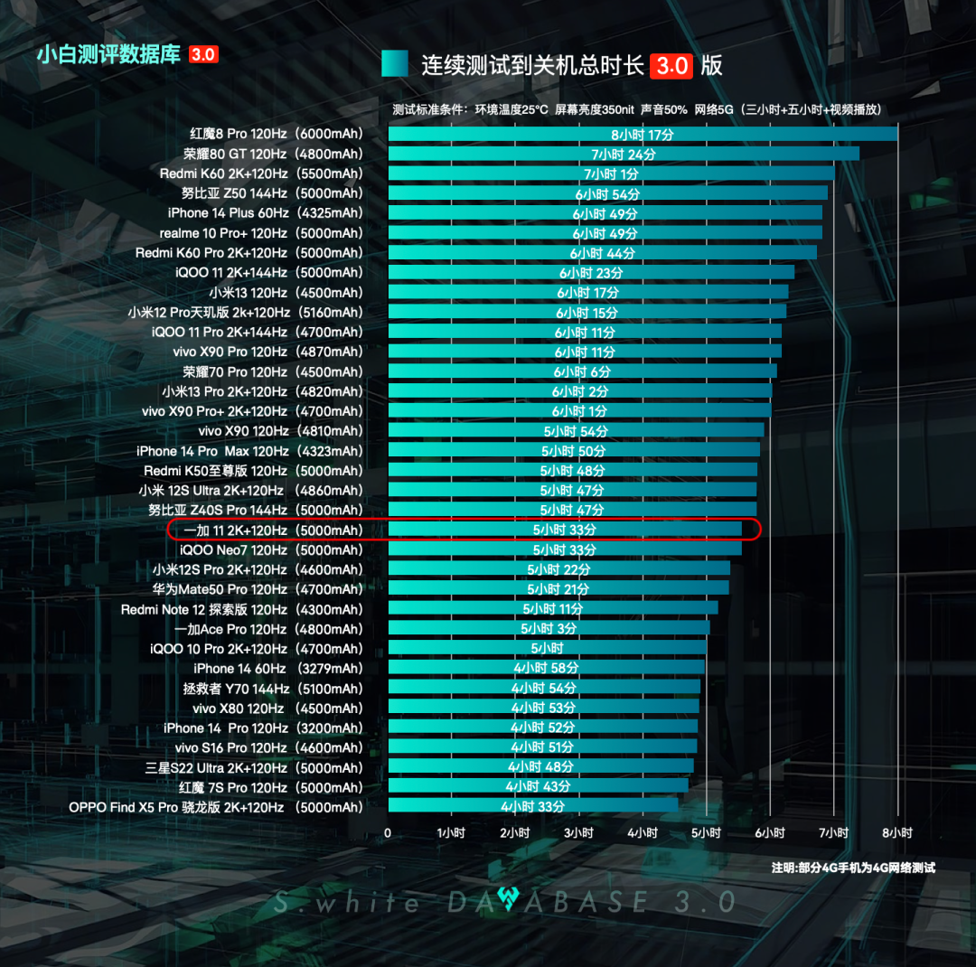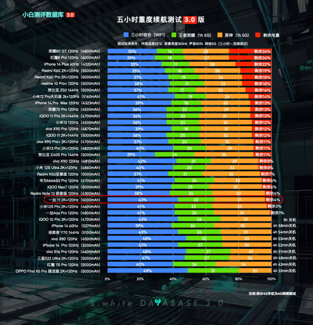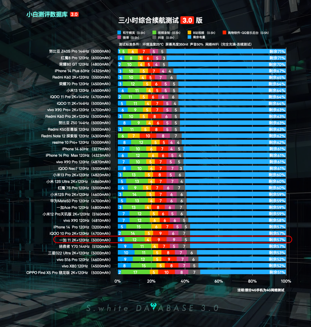 一加11续航实测:2K+120Hz 5000mAh,在小白测评数据库3.0的三小时综合续航模型测试下电量剩余57%,五小时重度续航模型下电量剩余4%,连续测试到关机总用时5小时33分钟;(*配图榜单仅代表目前小白测评数据库3.0模型下已测试机型的排行,不代表机圈所有手机排行)