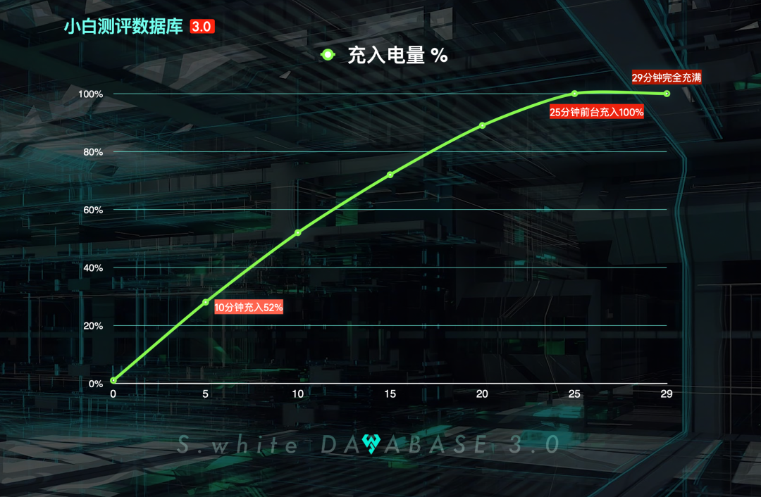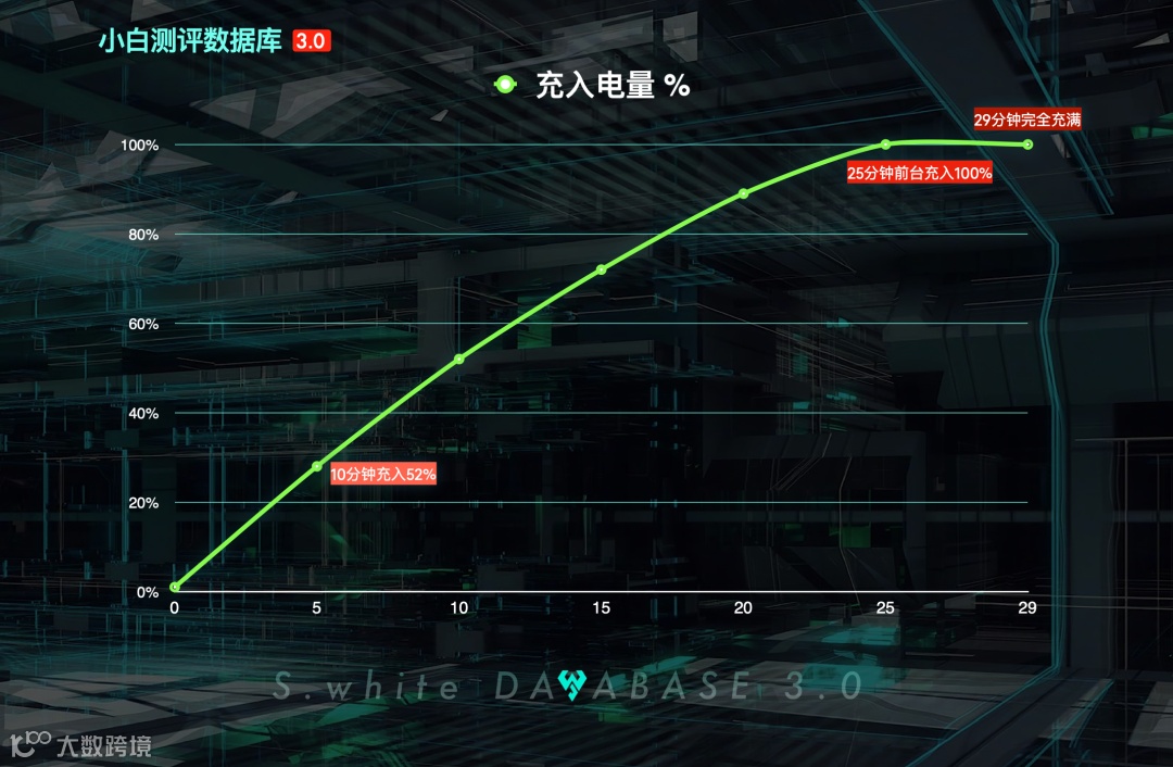 一加11充电速度实测:5000mAh电池+100W有线充电,10分钟充入电量52%,25分钟前台充入100%(实际充入96.06%),29分钟完全充满。