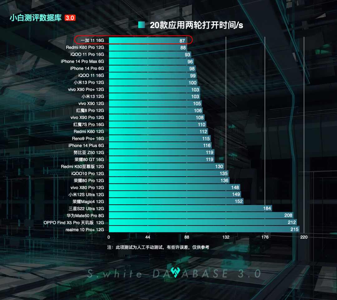 一加11综合性能实测:①游戏表现:原神最高画质,平均帧率59.8帧,功耗5.6W,机身最高47.1℃;王者荣耀120帧+高清画质,平均帧率120帧,功耗3.9W;②20款应用两轮打开时间87秒(*此项为人工手动测试,仅供参考);(*配图榜单仅代表目前小白测评数据库3.0模型下已测试机型的排行,不代表机圈所有手机排行)
