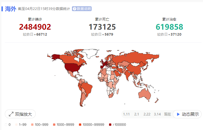 新冠疫情持续在全球蔓延和发展,全球确诊人数即将超过250万。