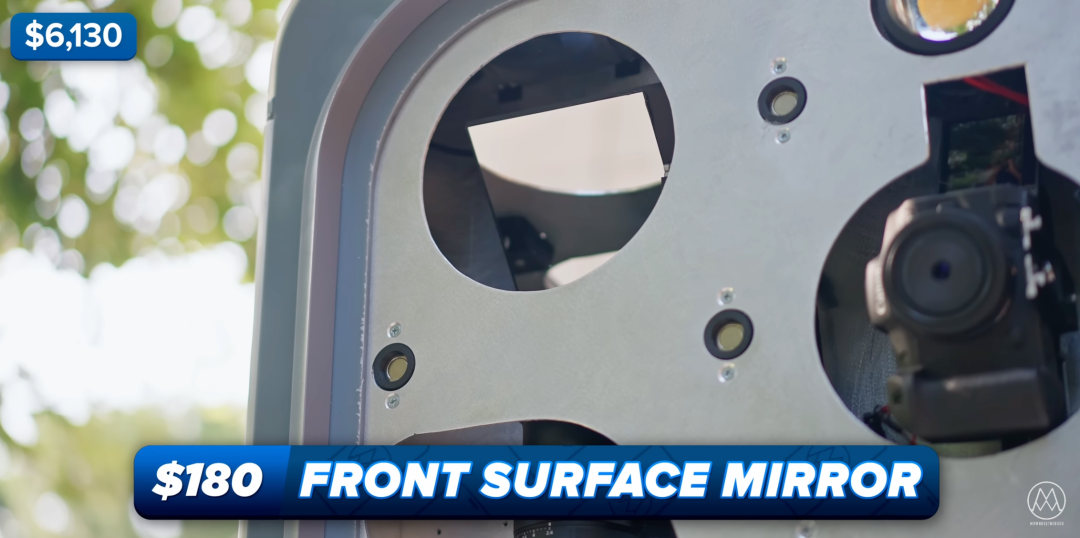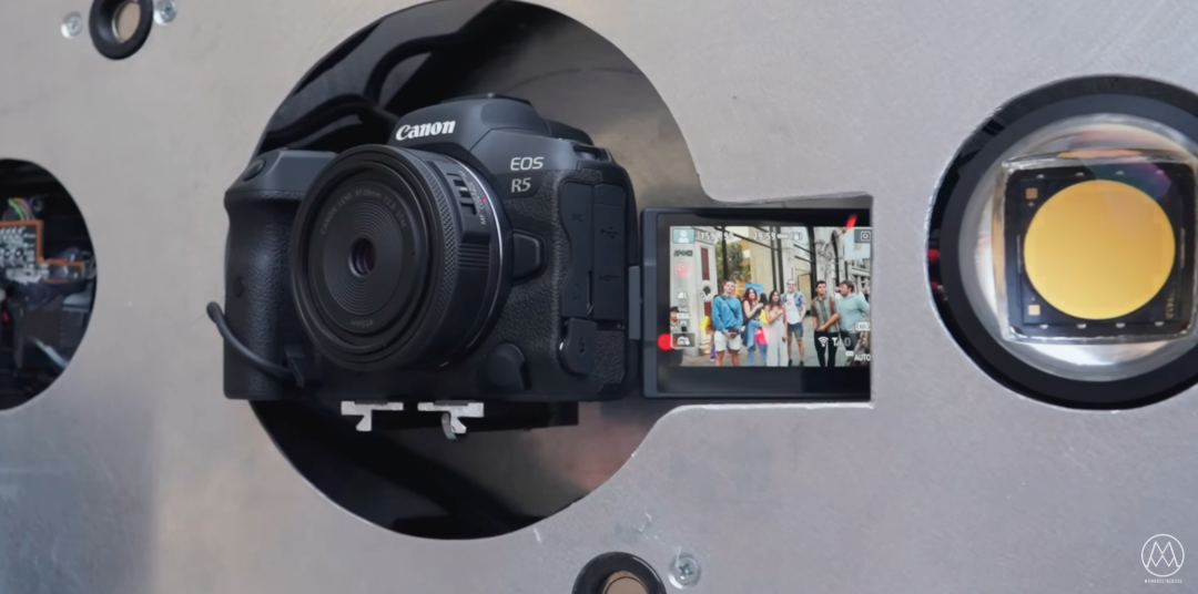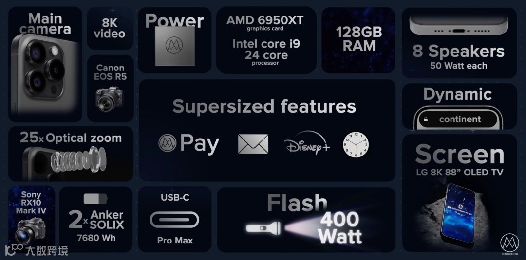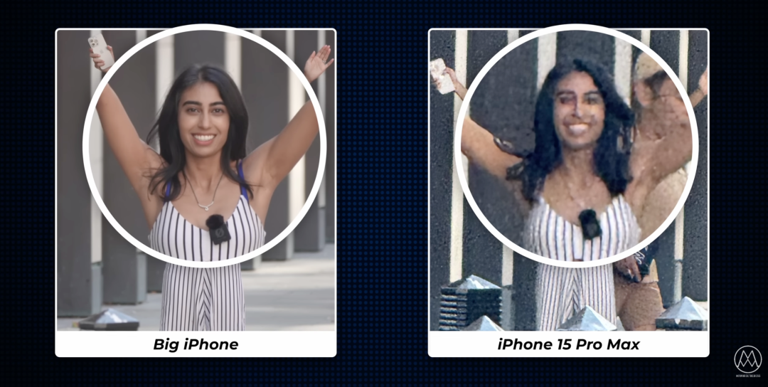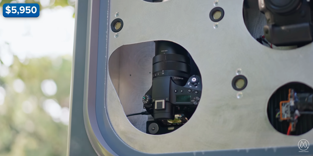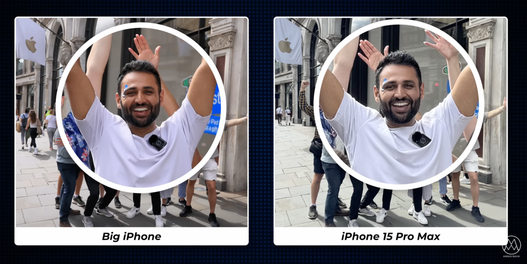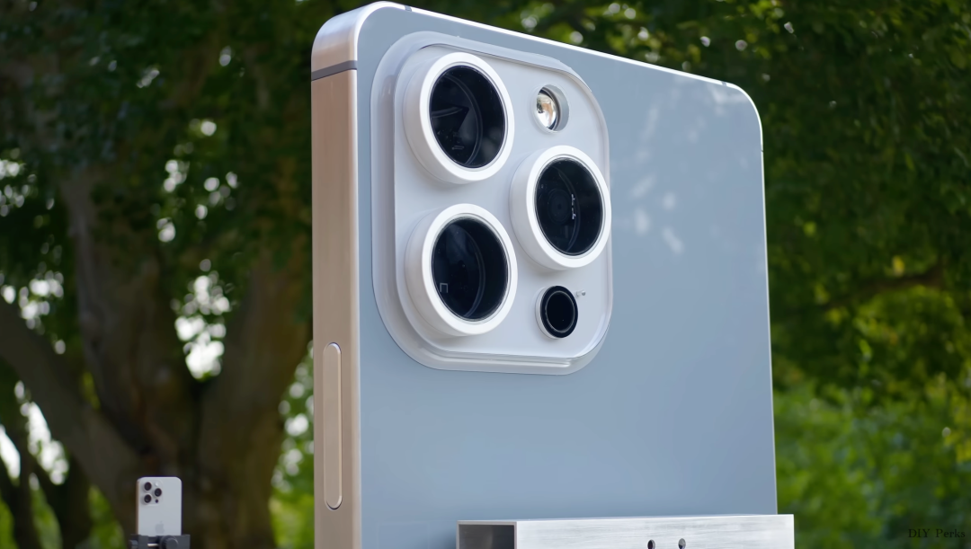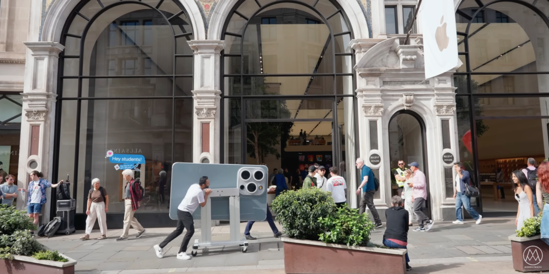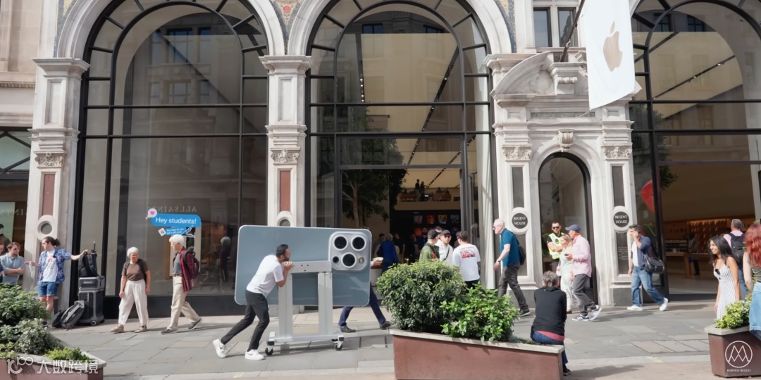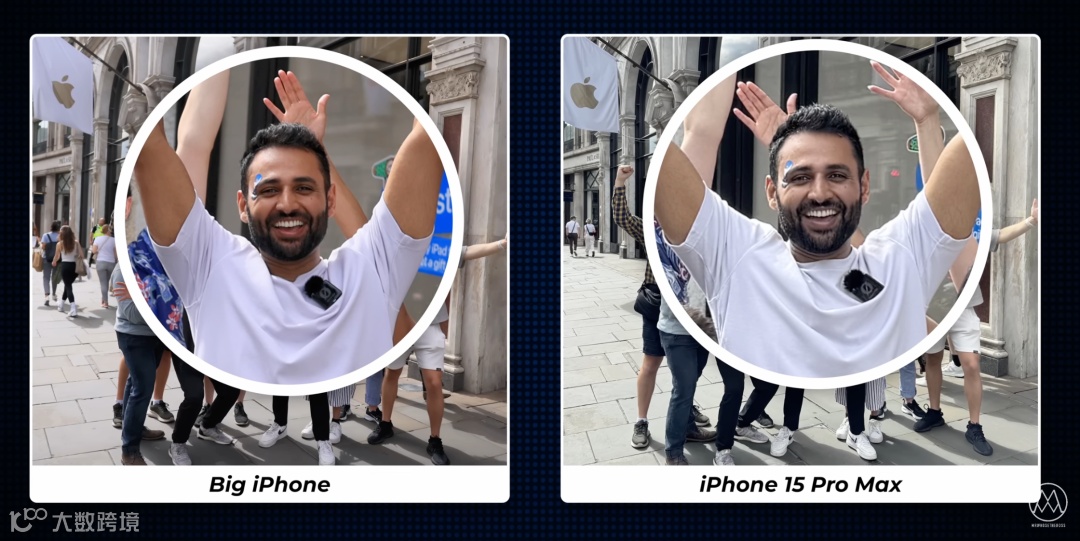 影像也值得一提,“巨型iPhone”的“浴霸三摄”其实是两台相机+一块镜子,左侧是索尼RX10 Mark 4搭配镜子,可实现25X光学变焦;右侧那颗镜头实际是台佳能EOS R5,可以拍摄8K分辨率视频;视频中还在相同场景下对比了iPhone 15 Pro Max手机拍摄的效果。