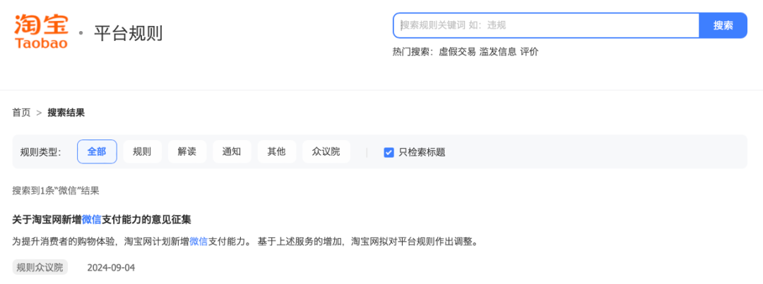 如上图所见,当日淘宝发布公告,称:为提升消费者购物体验,淘宝计划新增微信支付能力,基于上述服务的增加,淘宝网拟对平台规则作出调整,将于本公告公示七天后逐步向所有淘宝天猫平台卖家开放。