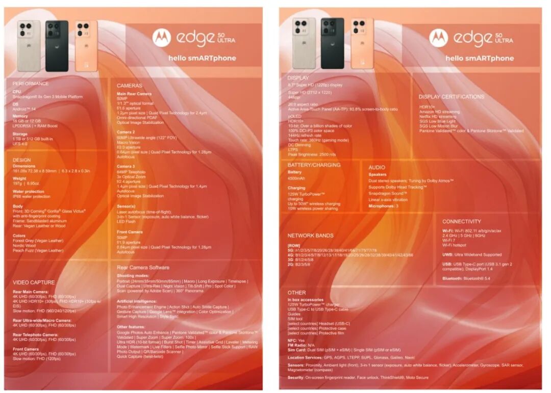 配置方面,Moto Edge 50 Ultra采用6.7英寸1.5K分辨率144Hz刷新率的OLED曲屏,支持IP68防尘抗水,前置50MP,后置三摄50MP主摄+50MP超广角+64W 3X潜望长焦,骁龙8s Gen3,LPDDR5x、UFS 4.0,4500mAh电池、125W有线充电+50W无线充。