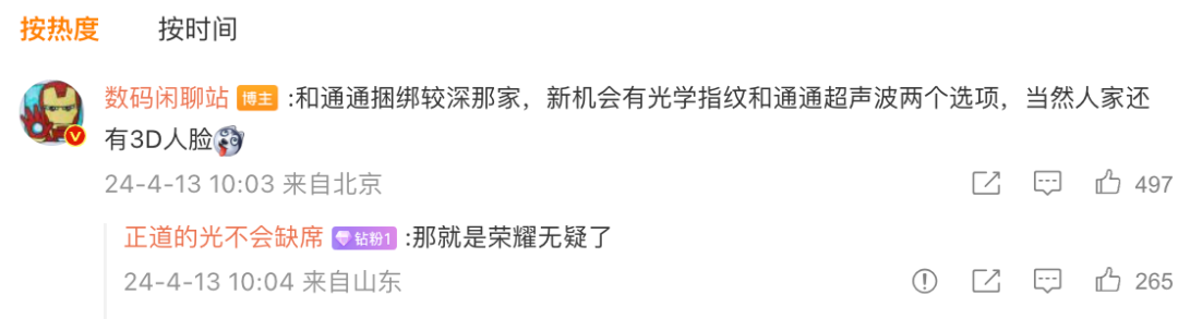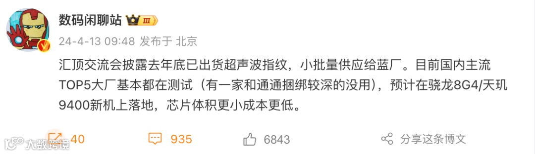 如上图所见,据数码闲聊站爆料,汇顶去年底已经出货超声波指纹,小批量供应给蓝厂,目前国内主流TO5大厂基本都在测试(荣耀没用汇顶方案,新机有光学屏下指纹、高通超声波两个选项以及3D人脸),预计会在骁龙8 Gen4和天玑9400新机上落地,相关方案芯片体积更小成本更低。如果消息属实的话,预计vivo X200系列有望率先落地(X100系列迭代机型目前不确定最终命名,此处X200为代称)。
