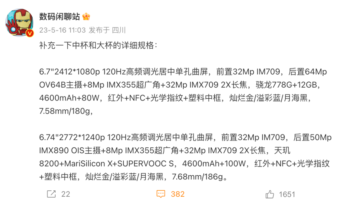 其爆料的Reno10 Pro主要配置:6.74英寸2772*1240分辨率120Hz高频调光居中单孔曲屏,前置32MP IM709,后置50MP IMX890 OIS主摄+8MP IMX355超广角+32MP IMX709 2X长焦,天玑8200+MariSilicon X+SUPERVOOC S,4600mAh+100W,红外+NFC+光学指纹+塑料中框,灿烂金/溢彩蓝/月海黑,7.68mm/186g。