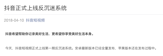 4月10日,抖音短视频正式上线第一期反沉迷系统。
