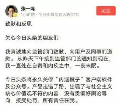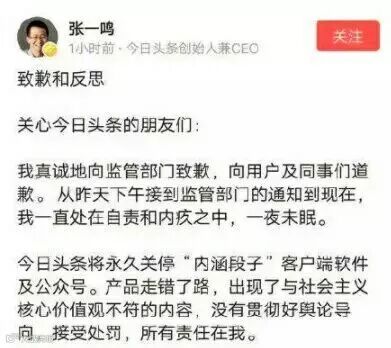 今日头条创始人、CEO张一鸣凌晨发文:“致歉和反思”。