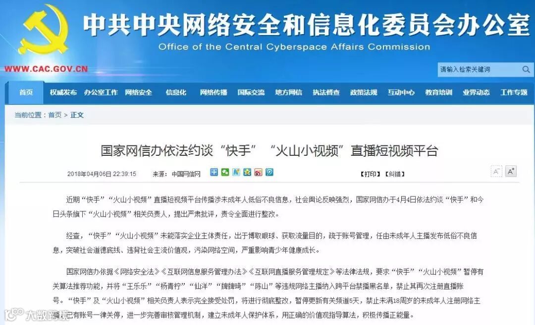 4月4日,国家广播电视总局针对社会舆论强烈关注的“今日头条”、“快手”两家网站播出有违社会道德节目等问题,立即会同属地管理部门严肃约谈了“今日头条”、“快手”两家网站主要负责人,提出严肃批评,责令全面进行整改。
