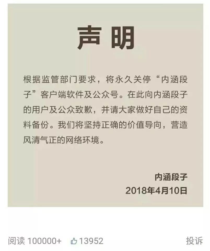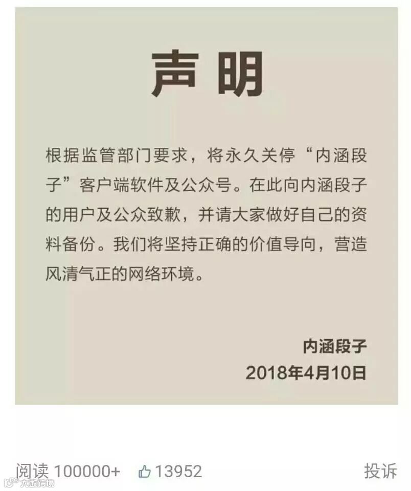 紧接着,内涵段子发表了一则声明,表示将永久关闭“内涵段子”