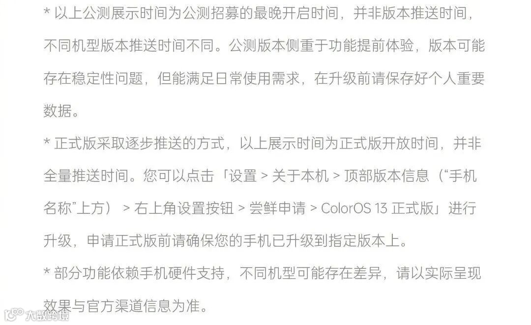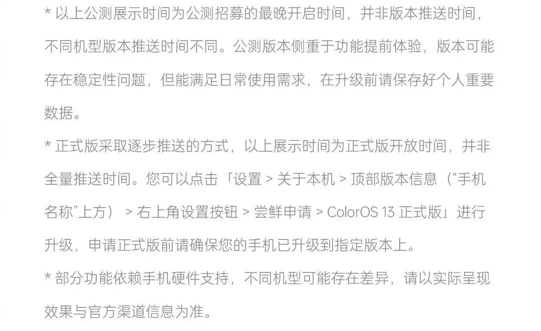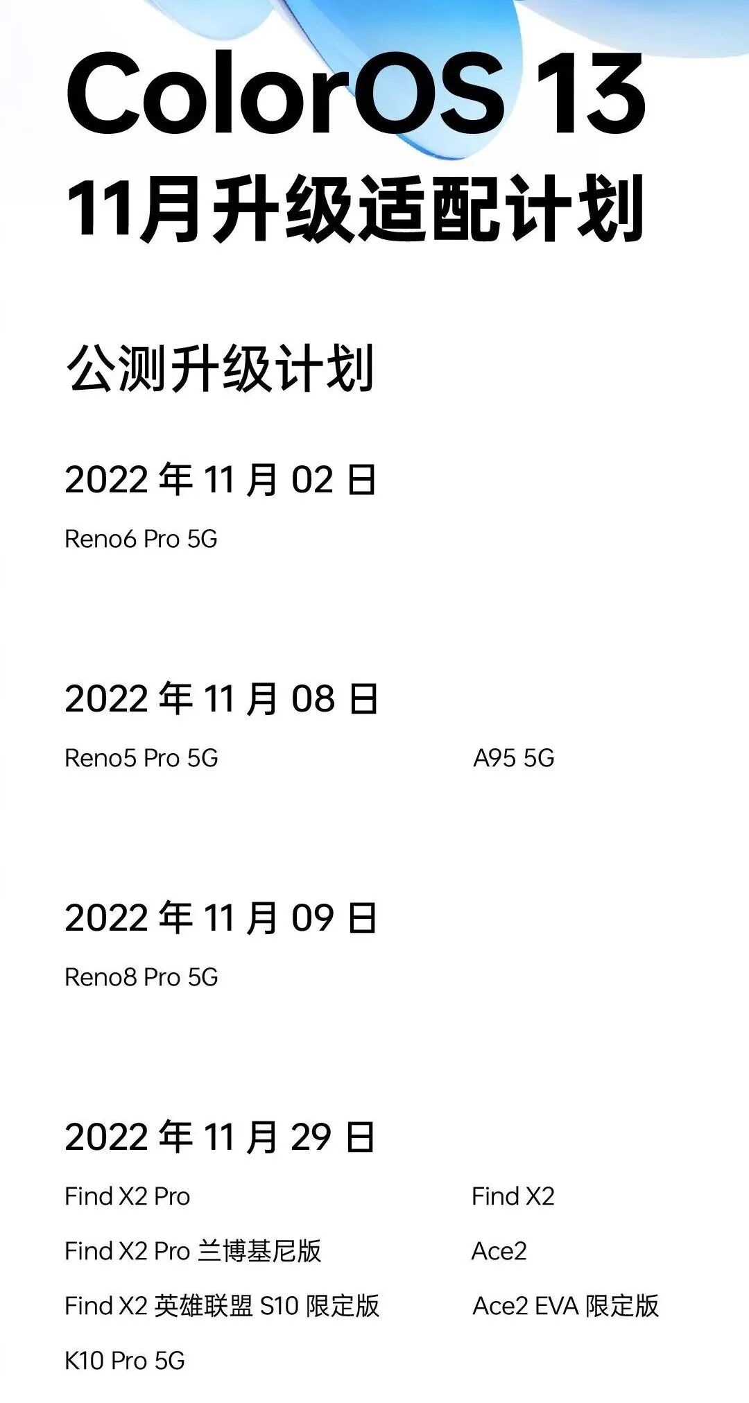 官方表示本月计划推送公测版升级的机型有:Reno6 Pro、Reno5 Pro、A95、Reno8 Pro、Find X2 Pro/兰博基尼版、Find X2/英雄联盟S10限定版、Ace2/EVA限定版、K10 Pro。