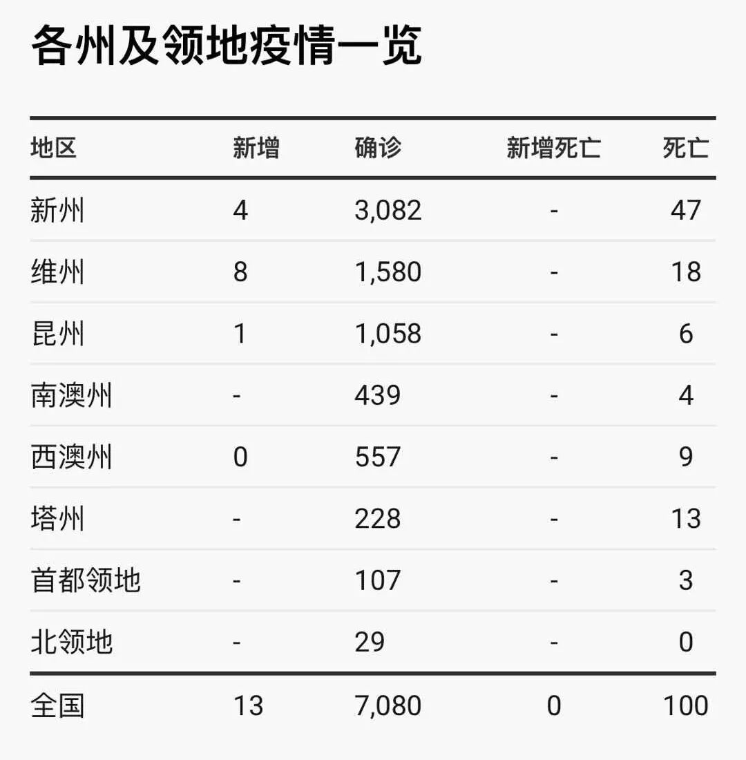 截止发稿前,澳洲累计确诊新冠肺炎患者7080例,死亡100例。其中新州3082例,维州1580例,昆州1058例,西澳557例,南澳439例,塔州228例,北领地29例,首都领地107例。