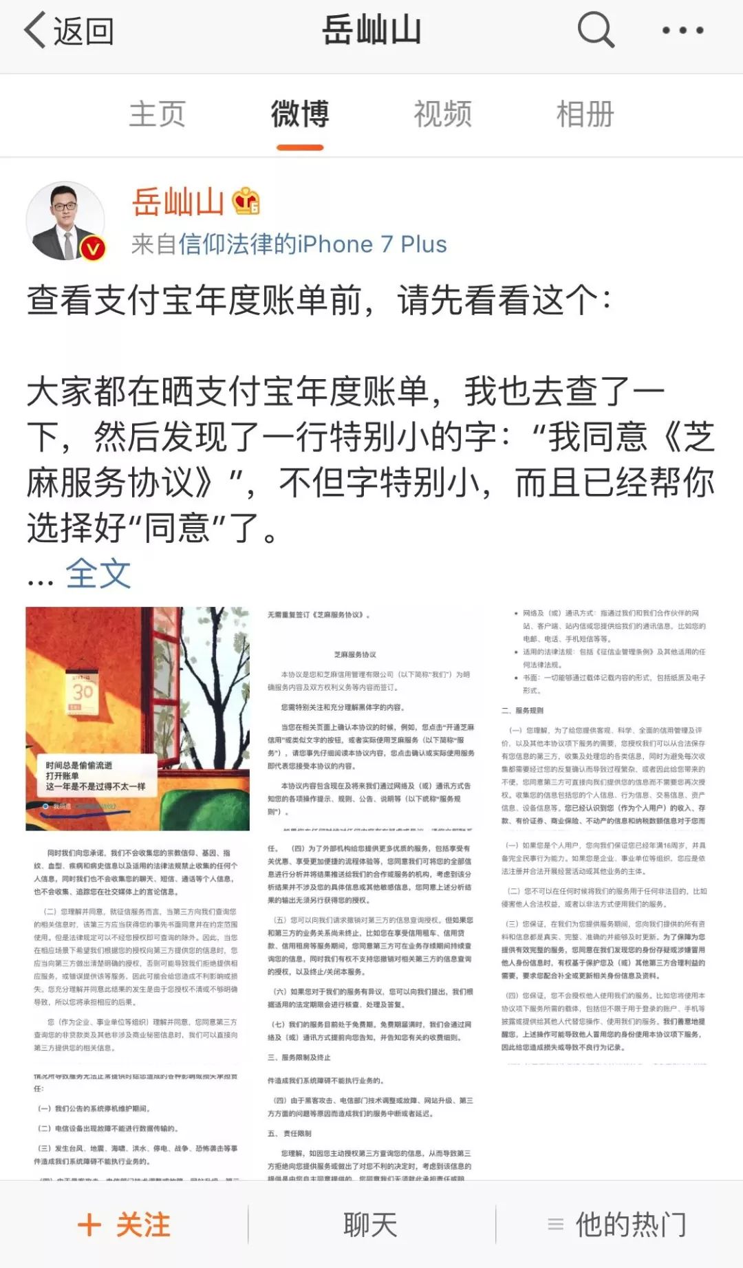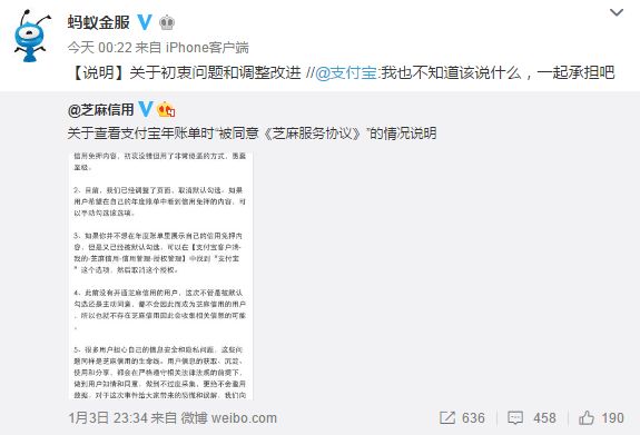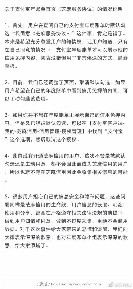 3日深夜,芝麻信用官方微博发布“关于查看支付宝年账单时被同意《芝麻服务协议》的情况说明”,称“这件事,肯定是错了”,并表示“深深的歉意”。