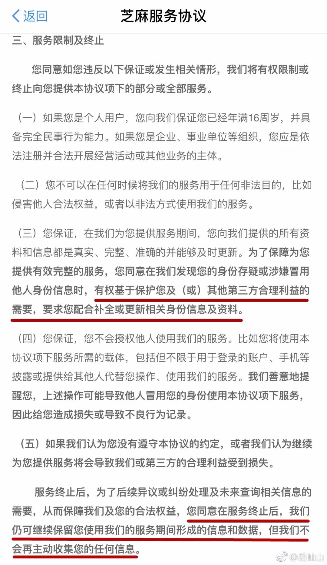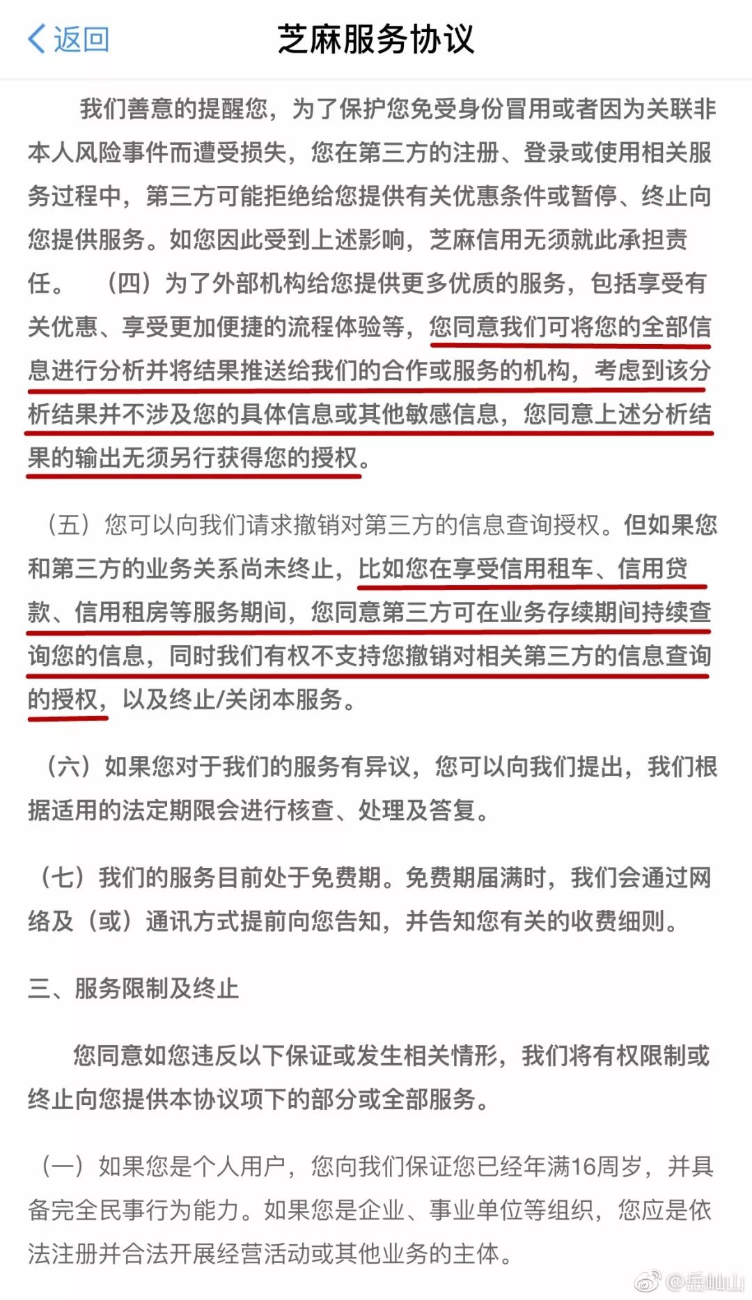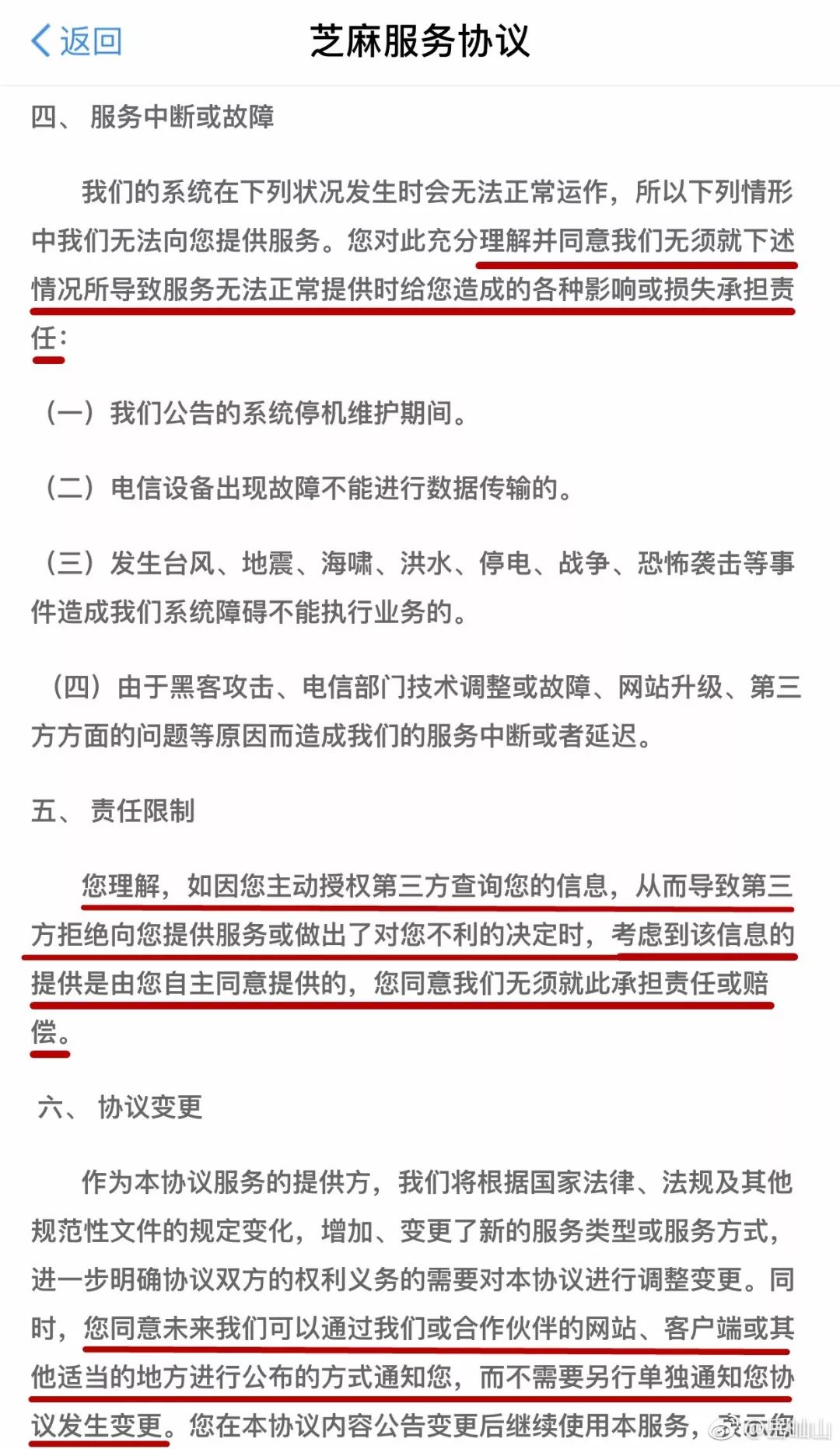 我们来看一下,如果选择了同意或默认“被同意”《芝麻服务协议》,该协议都有哪几个要点?(就像协议里写的:您需要特别关注和充分理解黑体字的内容)