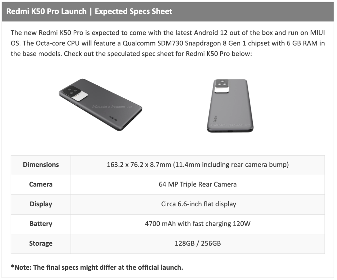 具体配置,爆料称Redmi K50 Pro预计将采用6.6英寸显示屏,后置6400万三摄,机身三围163.2*76.2*厚约8.7mm,内置4700mAh电池、配备120W充电等。