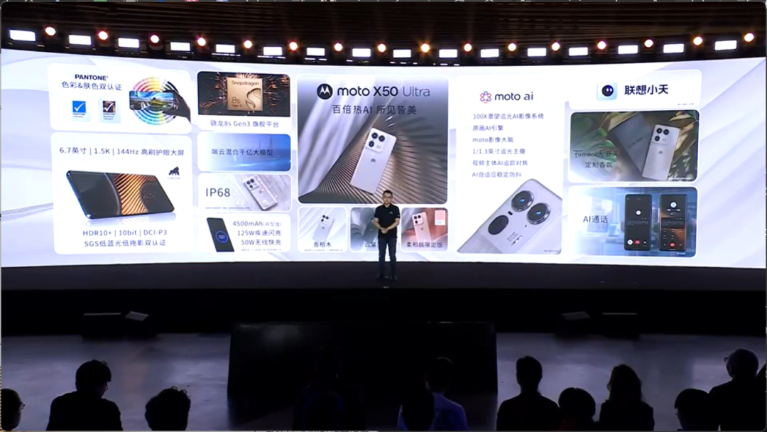 核心配置上,moto X50 Ultra前置50MP,后置三摄①50MP主摄有OIS ②50MP超广角微距③64MP 3X潜望长焦有OIS 最高支持100X数码变焦;搭载骁龙8s Gen3处理器,配备LPDDR5X、UFS 4.0,4500mAh电池、125W有线充电+50W无线充,支持IP68防尘防水。