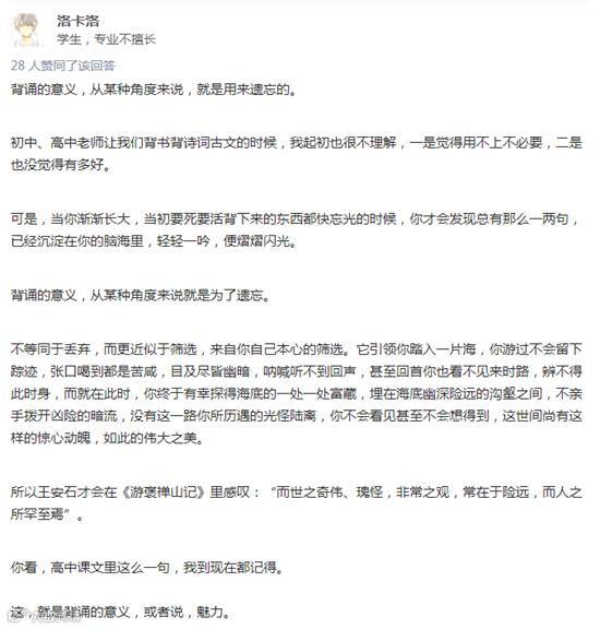 所以,“背诵全文”,不仅仅是背那一个个的字,更是要吃透文章内涵。《离骚》的悲壮、《阿房宫赋》的壮美、《长恨歌》的哀婉……正如上面那位网友所说,世间尚有“如此的伟大之美”。吃透了,你就可以流利又富有感情地诵出来,中华文化骨子里的东西也会在你脑海中、在你心中沉淀下来。