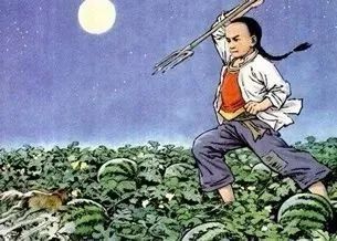 【《少年闰土》节选】深蓝的天空中挂着一轮金黄的圆月,下面是海边的沙地,都种着一望无际的碧绿的西瓜。其间有一个十一二岁的少年,项带银圈,手捏一柄钢叉,向一匹猹尽力地刺去。那猹却将身一扭,反从他的胯下逃走了。