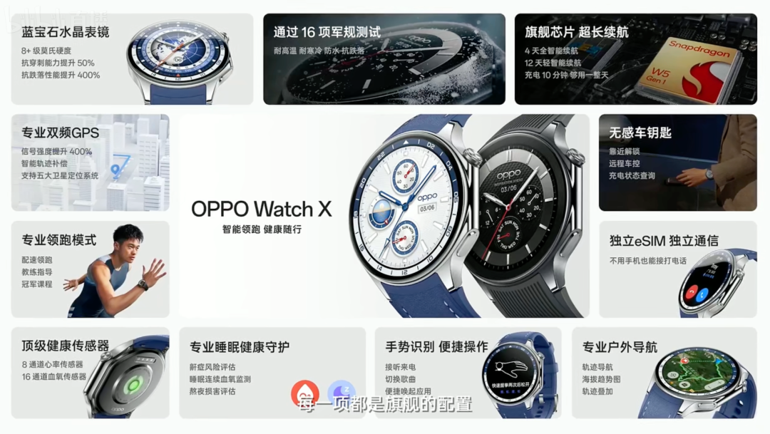 配置上,OPPO Watch X搭载骁龙W5 Gen1和恒玄BES2700BP,配备8通道心率传感器和16通道血氧传感器,L1+L5双频GPS定位,支持“专业领跑模式”功能,全新“熬夜风险评估功能”及独家“鼾症追踪”功能,2GB RAM+32GB ROM+4GB eMMC,IP68,双频GPS,内置500mAh电池,10W充电,全智能模式续航可到100小时(4天多),省电模式续航288小时(12天),支持eSIM,官方还表示OPPO Watch X搭载的微信手表版,支持独立使用。