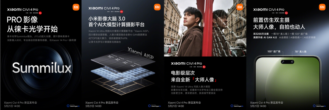 据预热,小米Civi4 Pro后置主摄为Redmi K70系列同款光影猎人800传感器,F1.63光圈,但不同的是,Civi4 Pro配备徕卡光学Summilux镜头,同时配备小米14 Ultra同款计算摄影平台「小米影像大脑3.0」,前置、后置相机都升级「大师人像」。前置双3200万主摄。