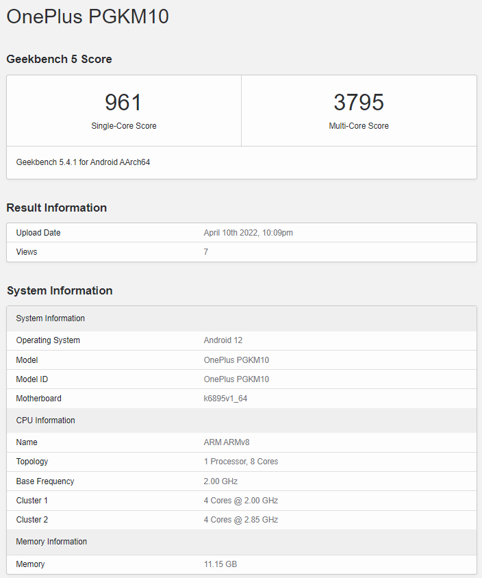 现据Geekbench 5跑分库信息披露,一加有一款型号为OnePlus PGKM10的新机现身,单核跑分961,多核跑分3795,内置12GB内存,运行Android 12。应该就是最新曝光的「一加Ace」新机。