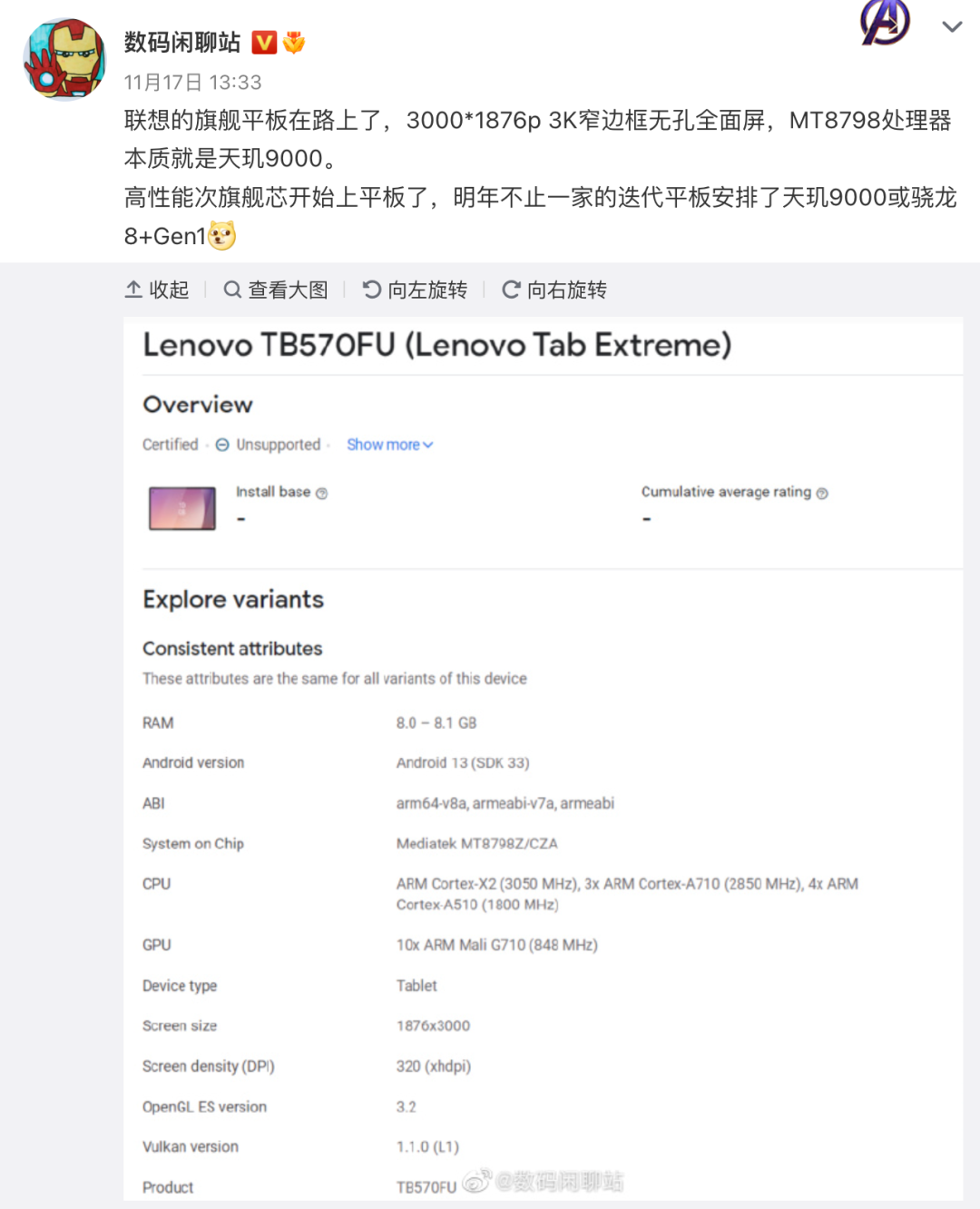 首先是联想的新款旗舰平板,相关界面显示其采用3000*1876分辨率的窄边框无孔曲面屏,搭载MT8798Z/CZA的处理器,爆料称MT8798处理器本质就是天玑9000。