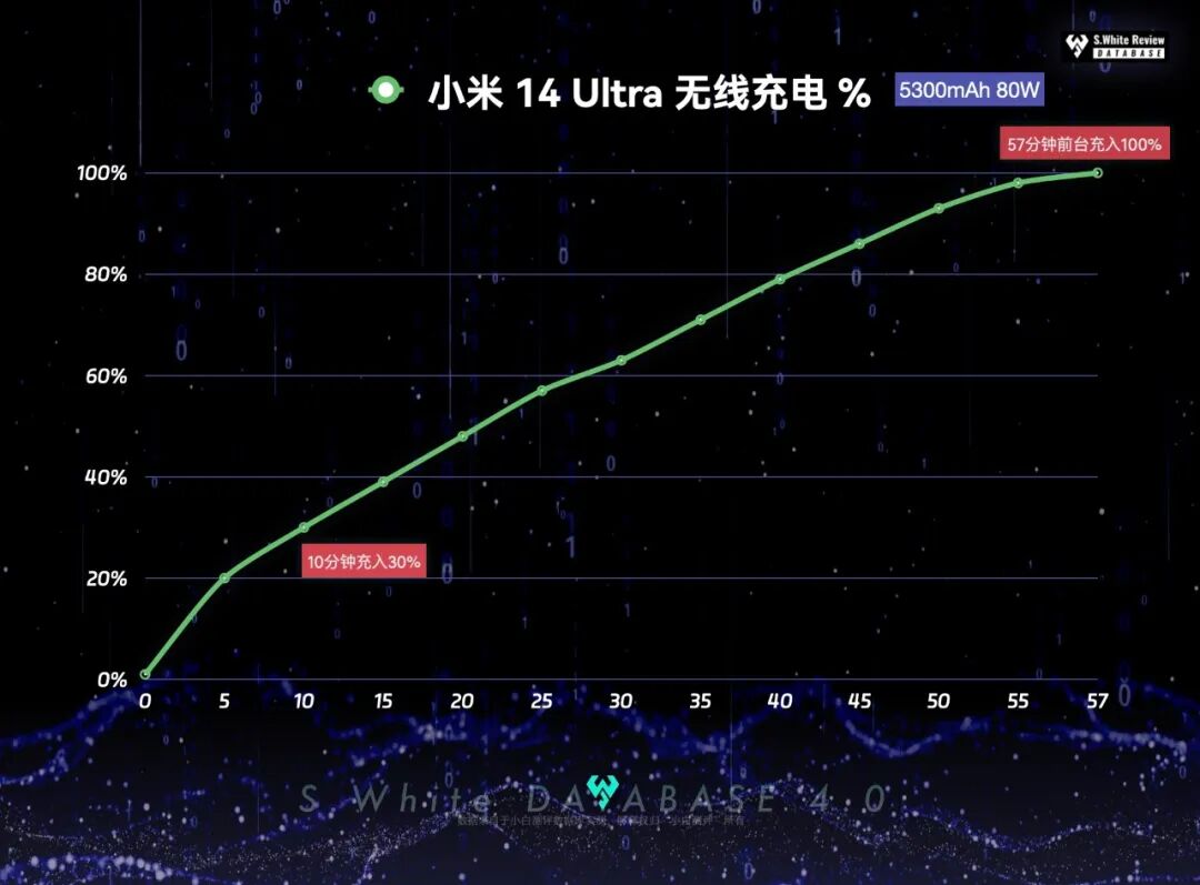 实测小米14 Ultra:5300mAh金沙江电池+80W无线充电,5分钟充入电量20%,30分钟充入63%,前台充满用时57分钟。